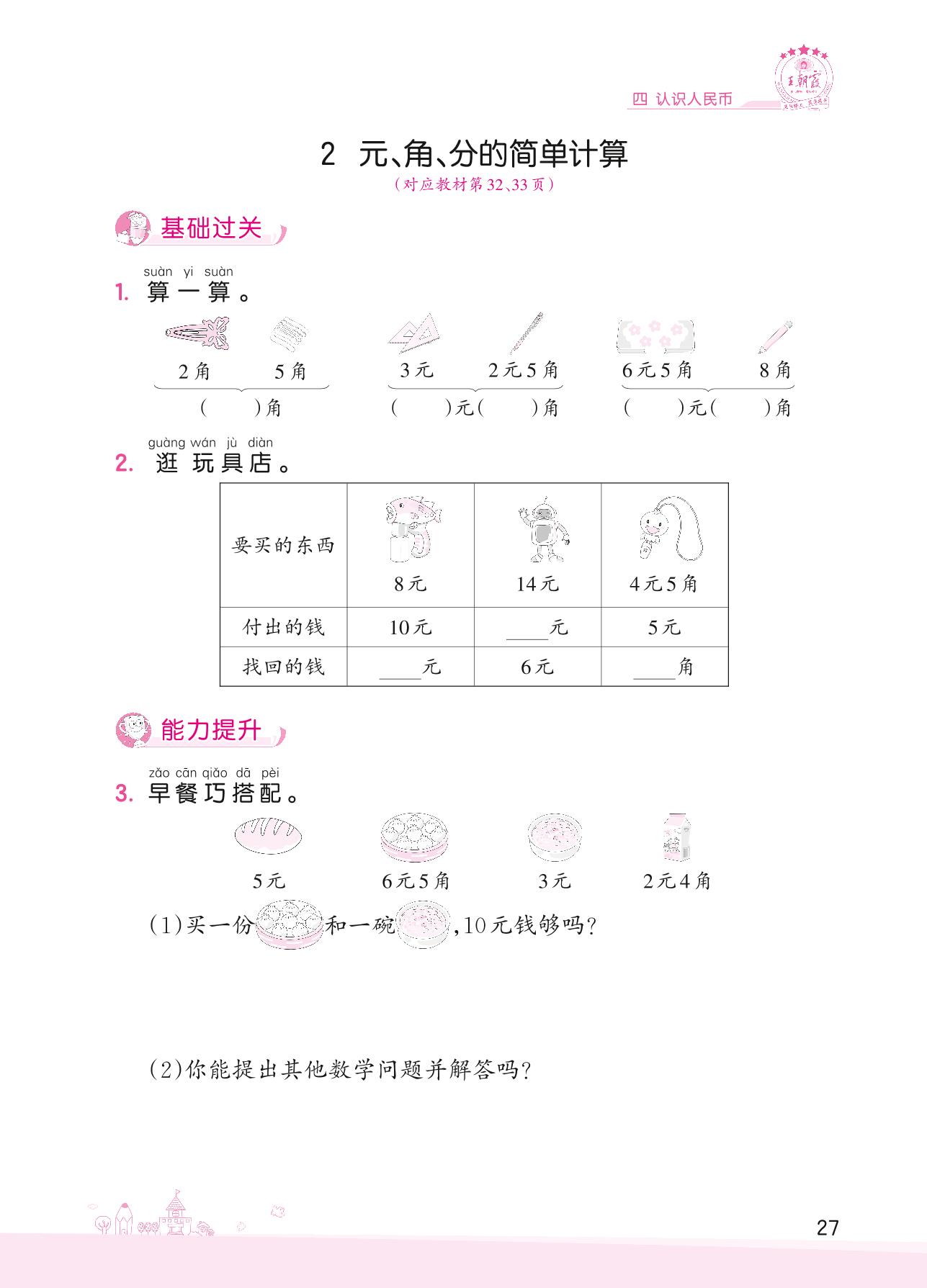 2022下册一年级数学冀教版 四 认识人民币——2 元、角、分的简单计算