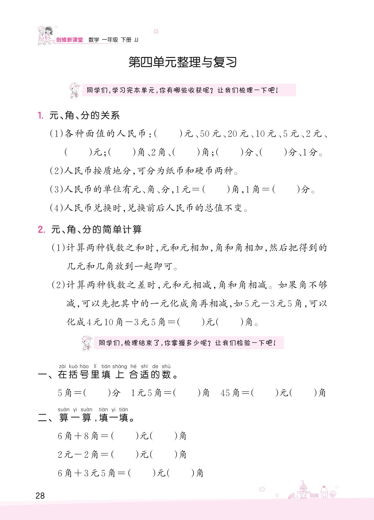 2022下册一年级数学冀教版 四 认识人民币——第四单元整理与复习