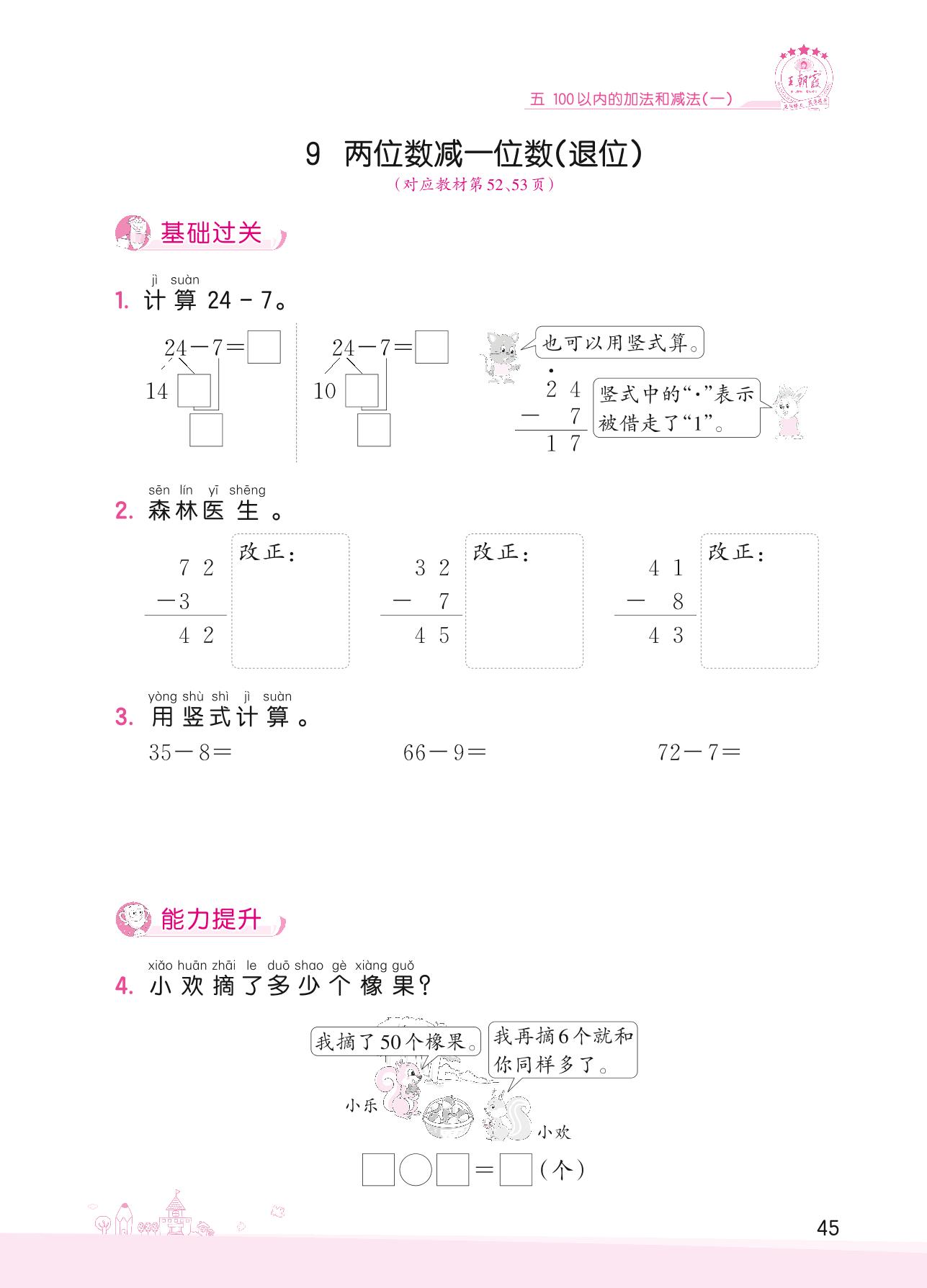 2022下册一年级数学冀教版 五 110以内的加法和减法(一)——9 两位数减一位数(退位)