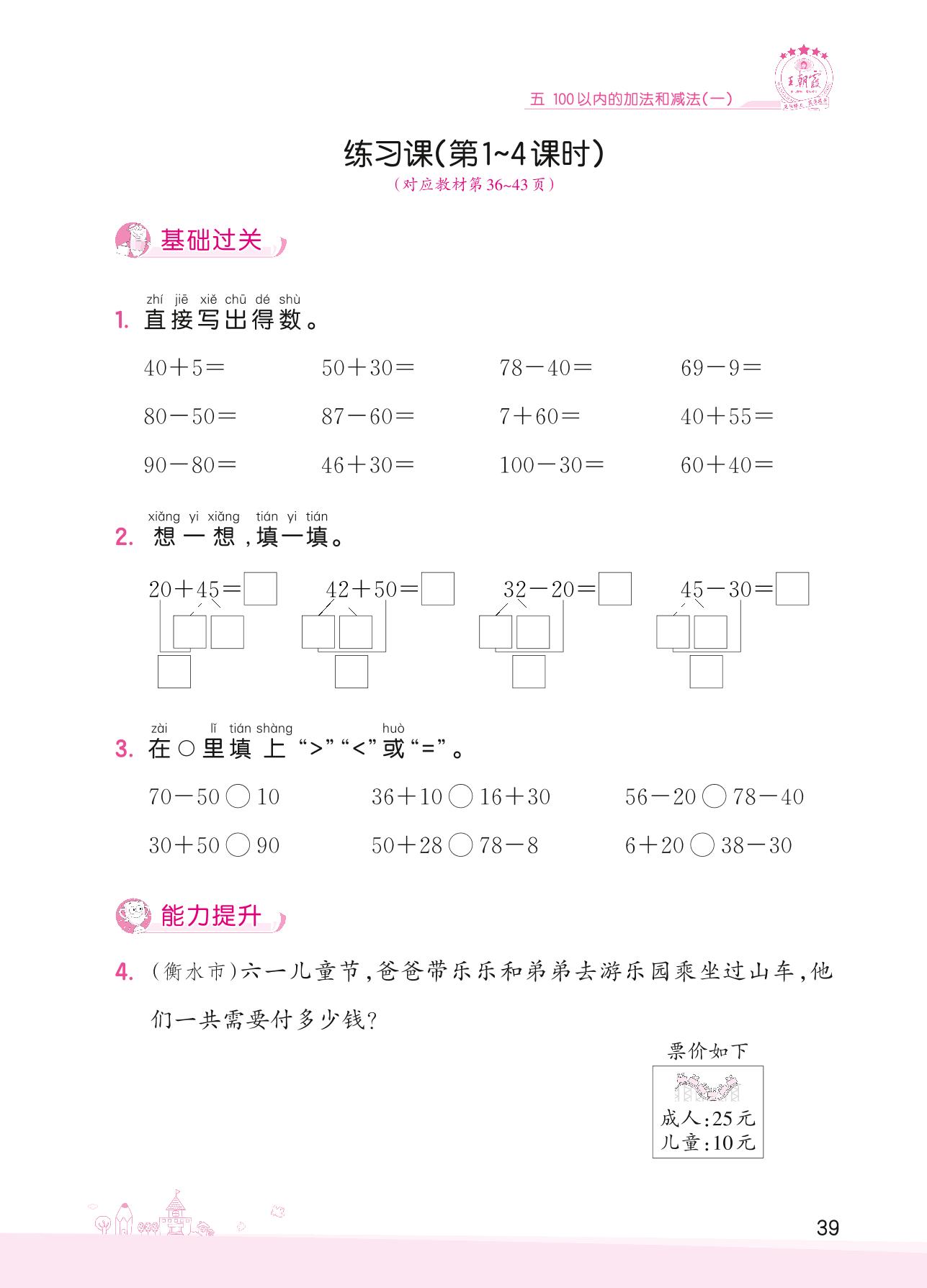 2022下册一年级数学冀教版 五 100以内的加法和减法(一)——练习课(第1~4课时)