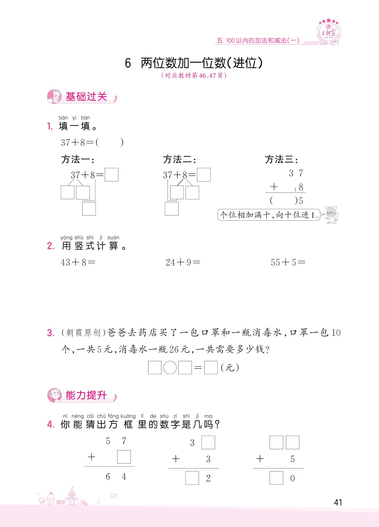 2022下册一年级数学冀教版 五 100以内的加法和减法(一)——6 两位数加一位数(进位)