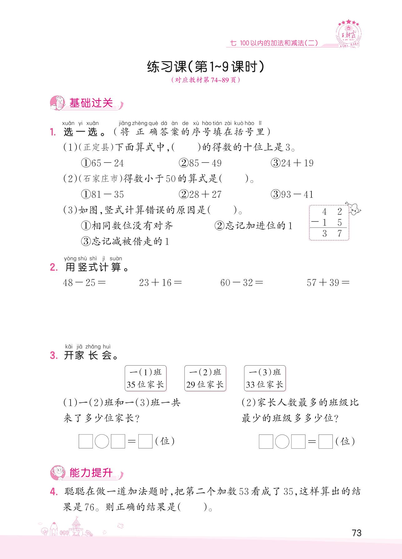 2022下册一年级数学冀教版 七 111以内的加法和减法(二)——练习课(第1~9课时)