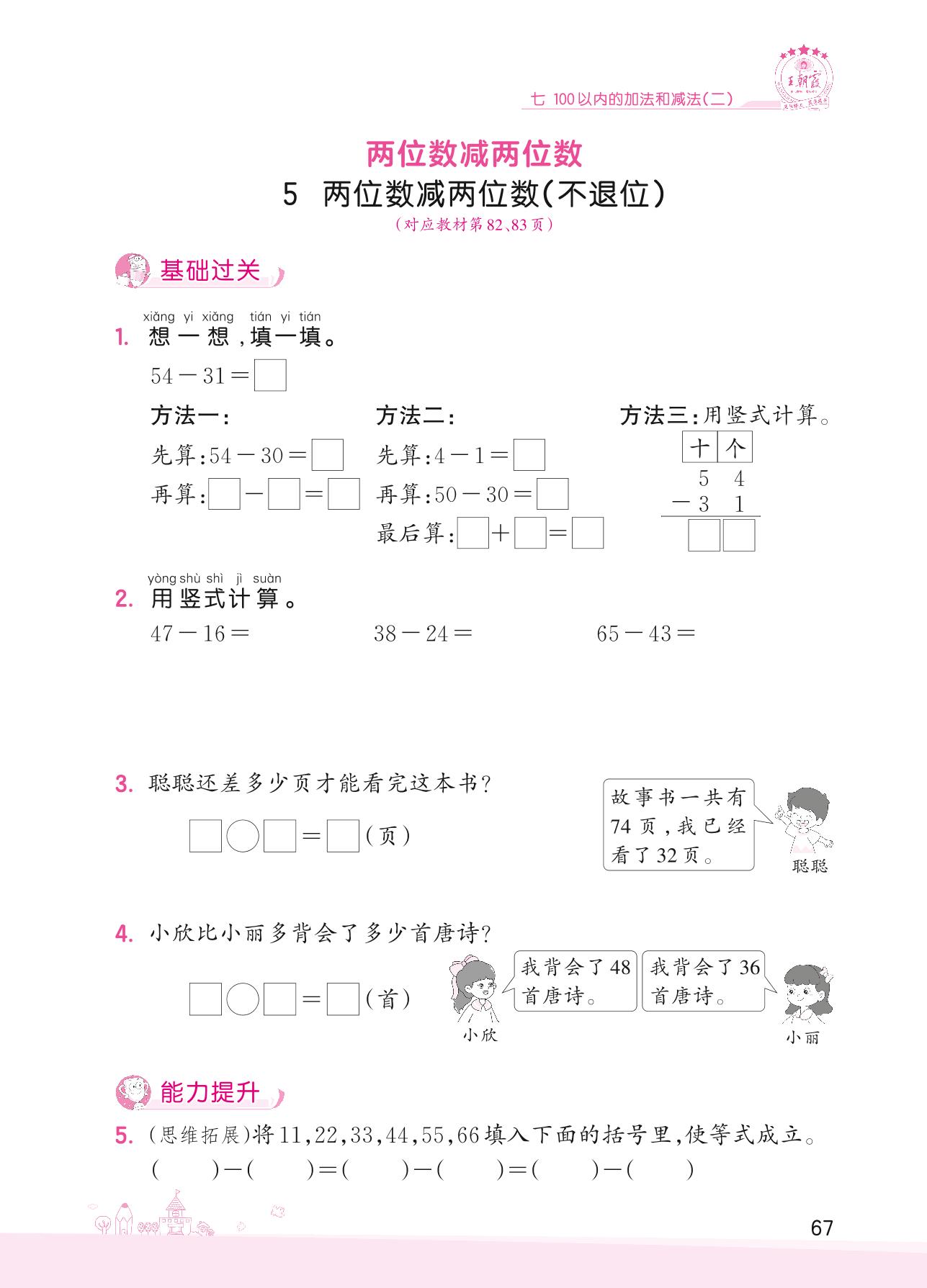 2022下册一年级数学冀教版 七 100以内的加法和减法(二)——5 两位数减两位数(不退位)