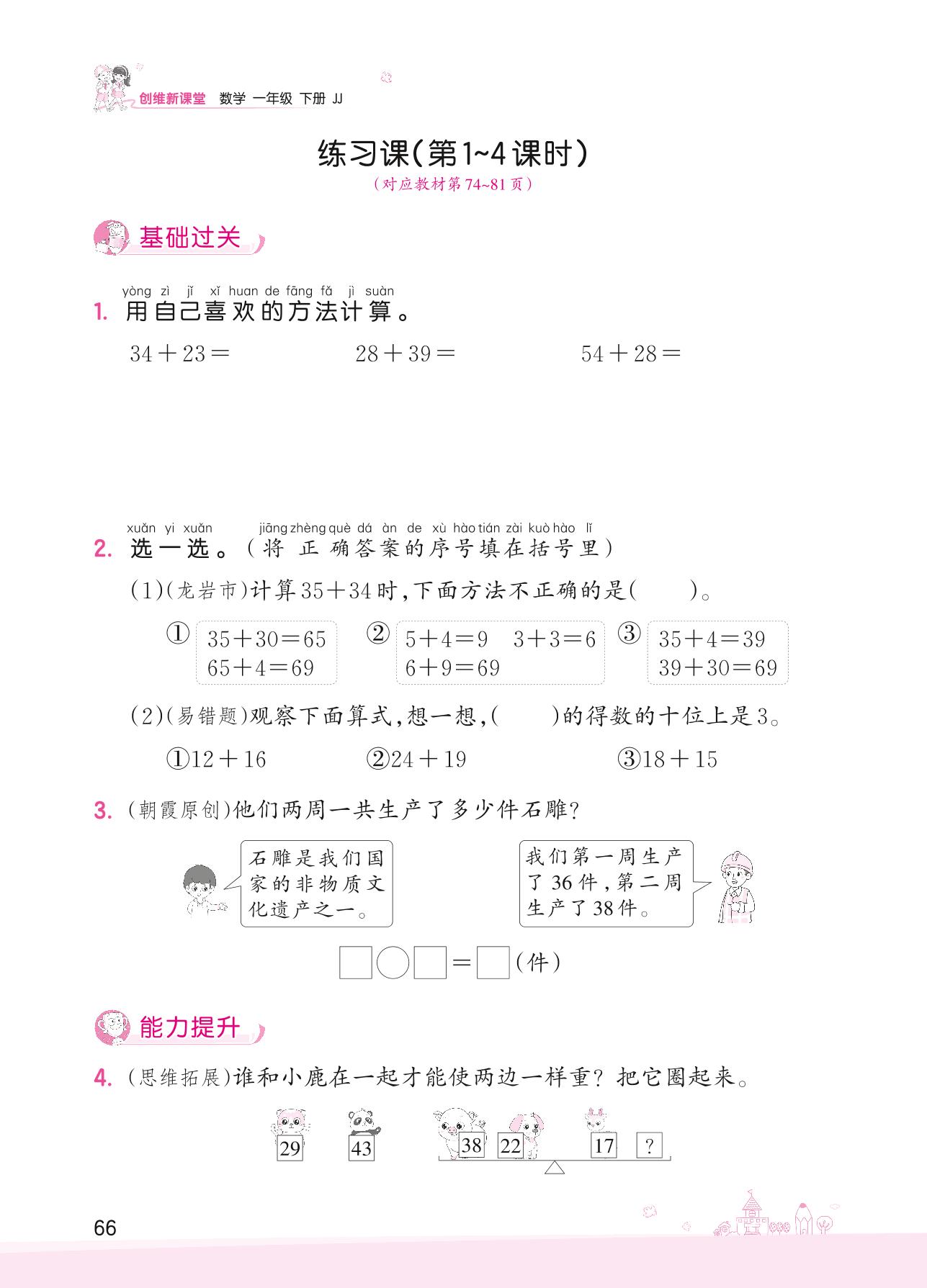 2022下册一年级数学冀教版 七 100以内的加法和减法(二)——练习课(第1~4课时)