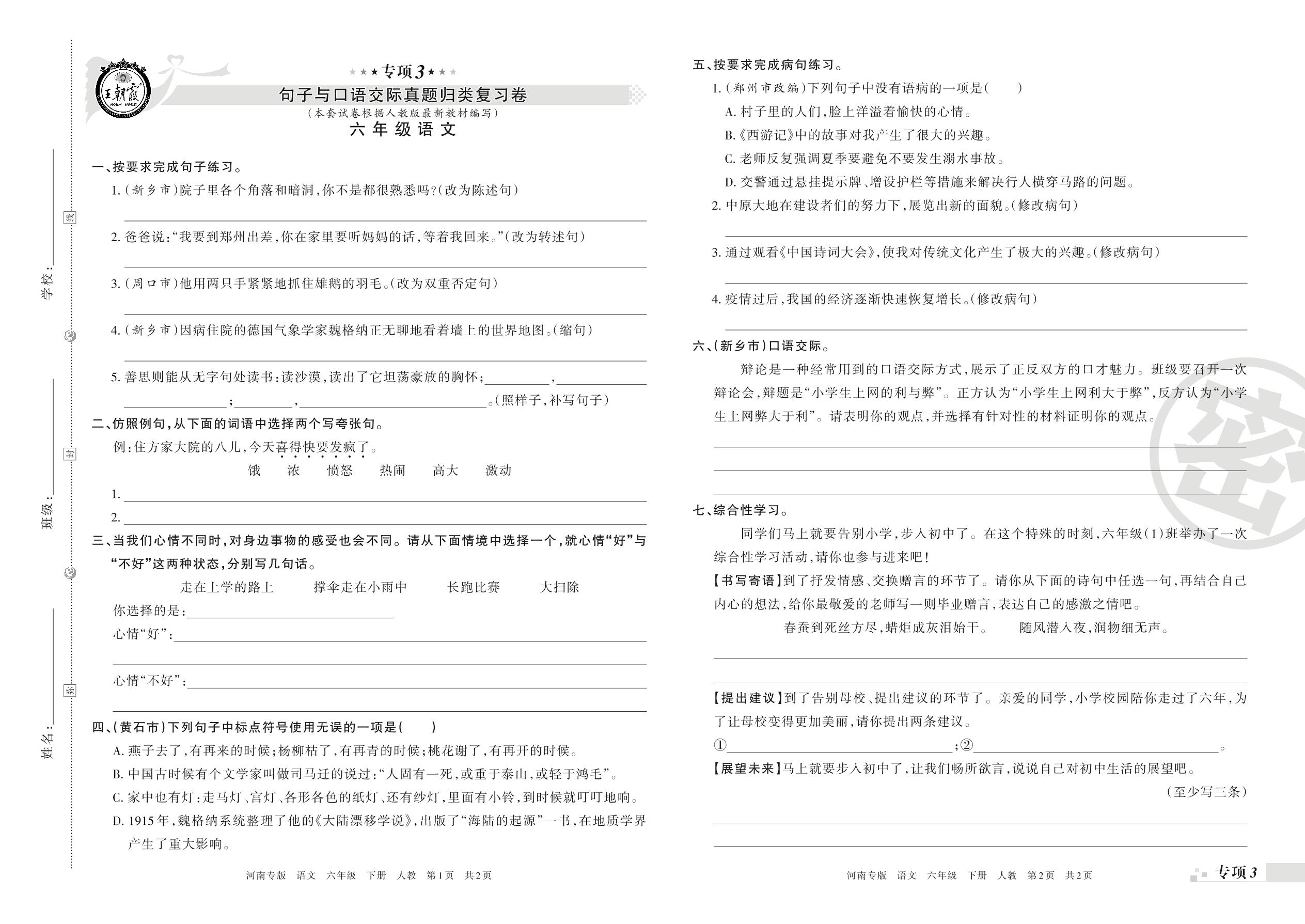 王朝霞期末专项卷——句子与口语交际、课文内容与积累运用真题归类复习六年级下册语文(人教版)【0】