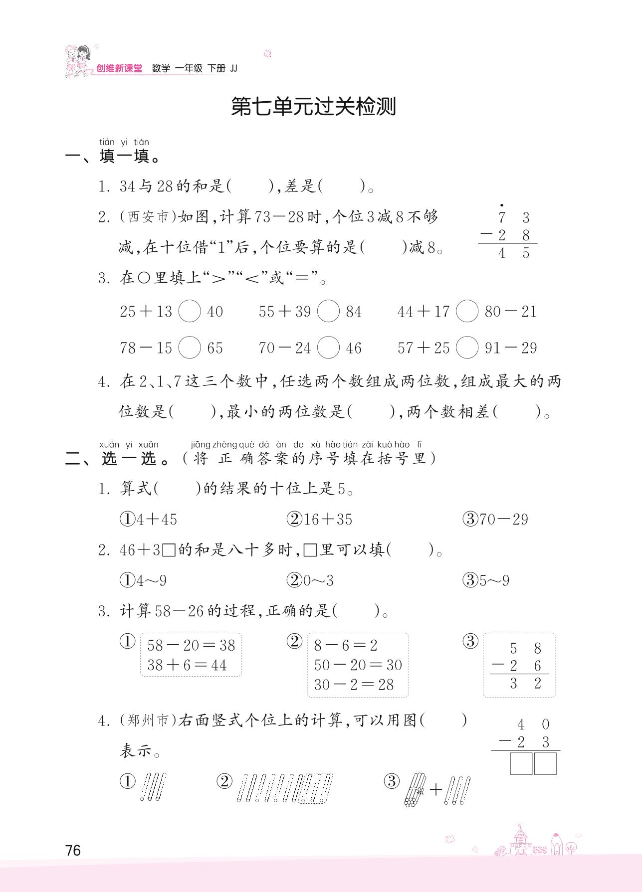 2022下册一年级数学冀教版 七 113以内的加法和减法(二)——第七单元过关检测