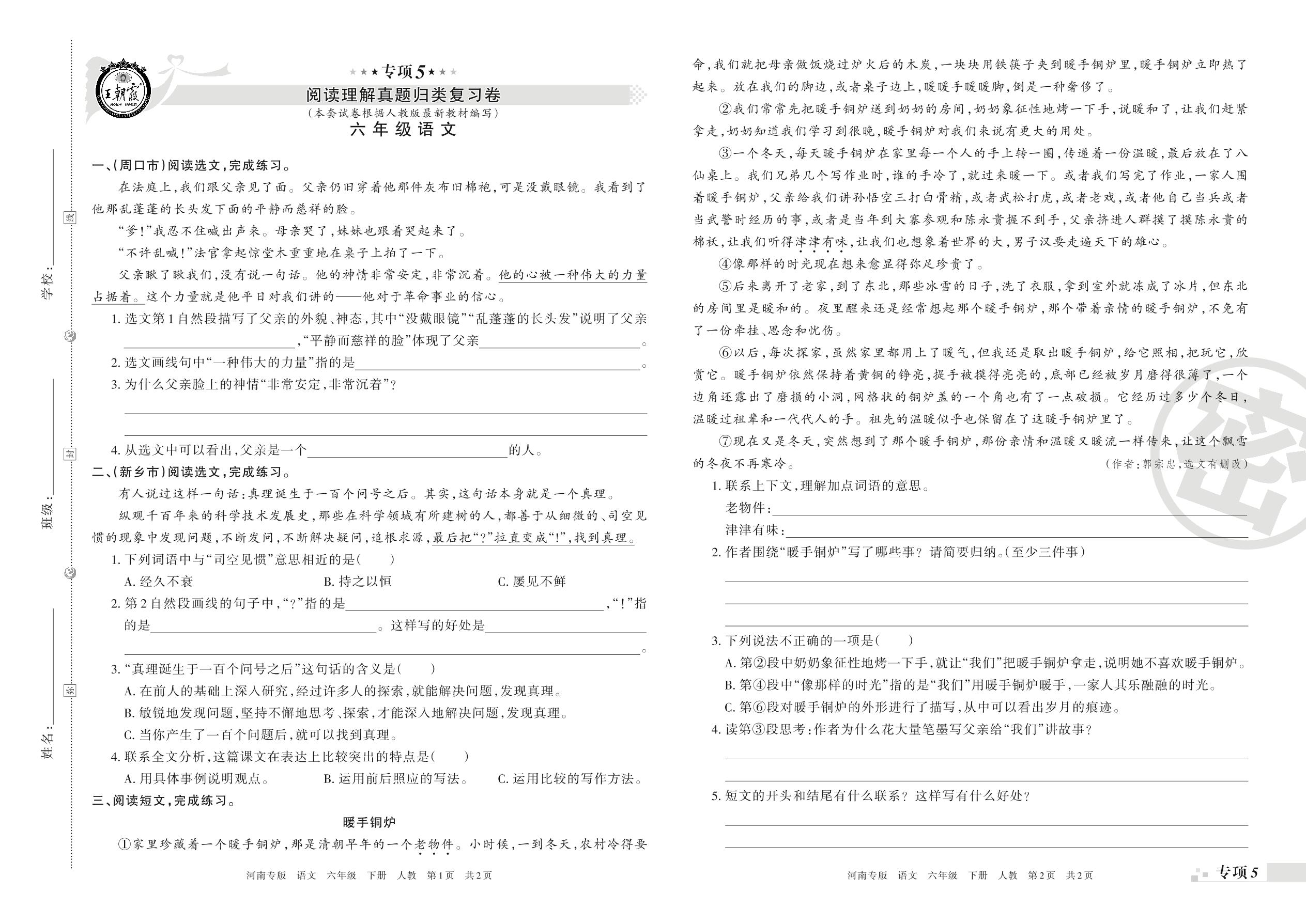 王朝霞期末专项卷——阅读理解真题归类复习、语言积累与运用六年级下册语文(人教版)【0】