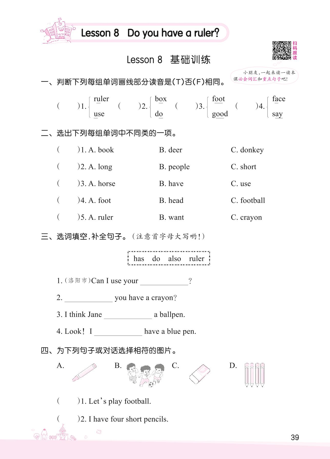 2022下册四年级英语科普版 Lesson 8 基础训练