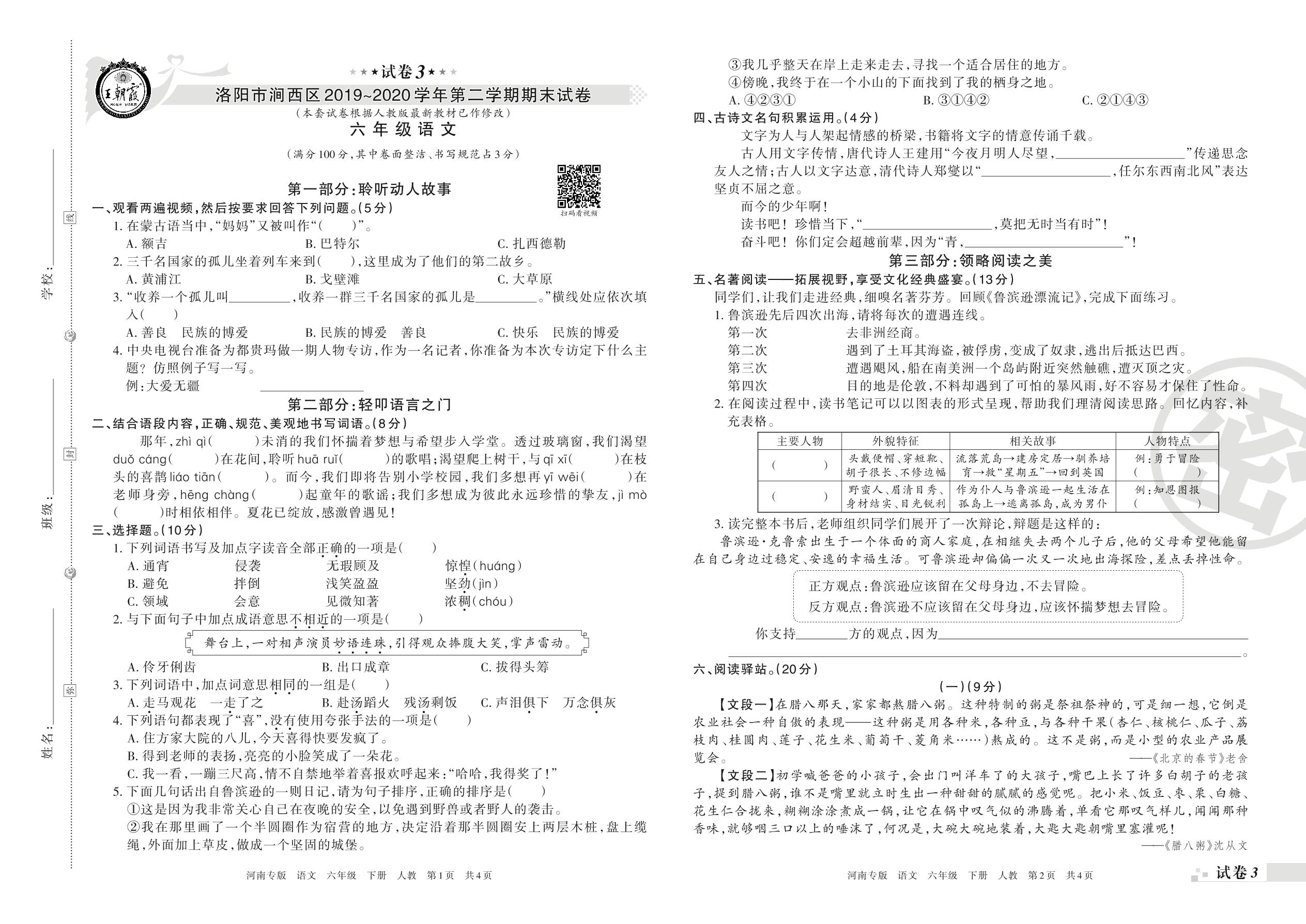 2019-2020学年第二学期洛阳市涧西区六年级语文试卷(人教版)【3】