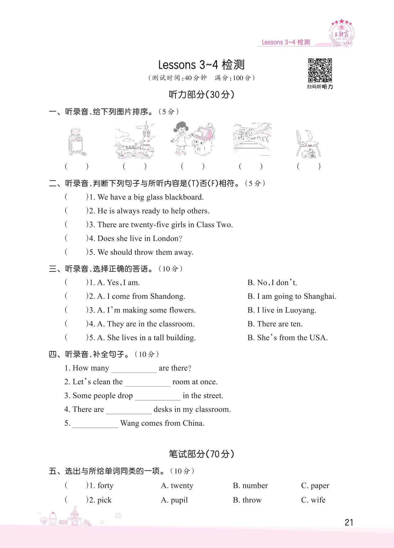 2022下册五年级英语科普版 Lessons 3~4 检测