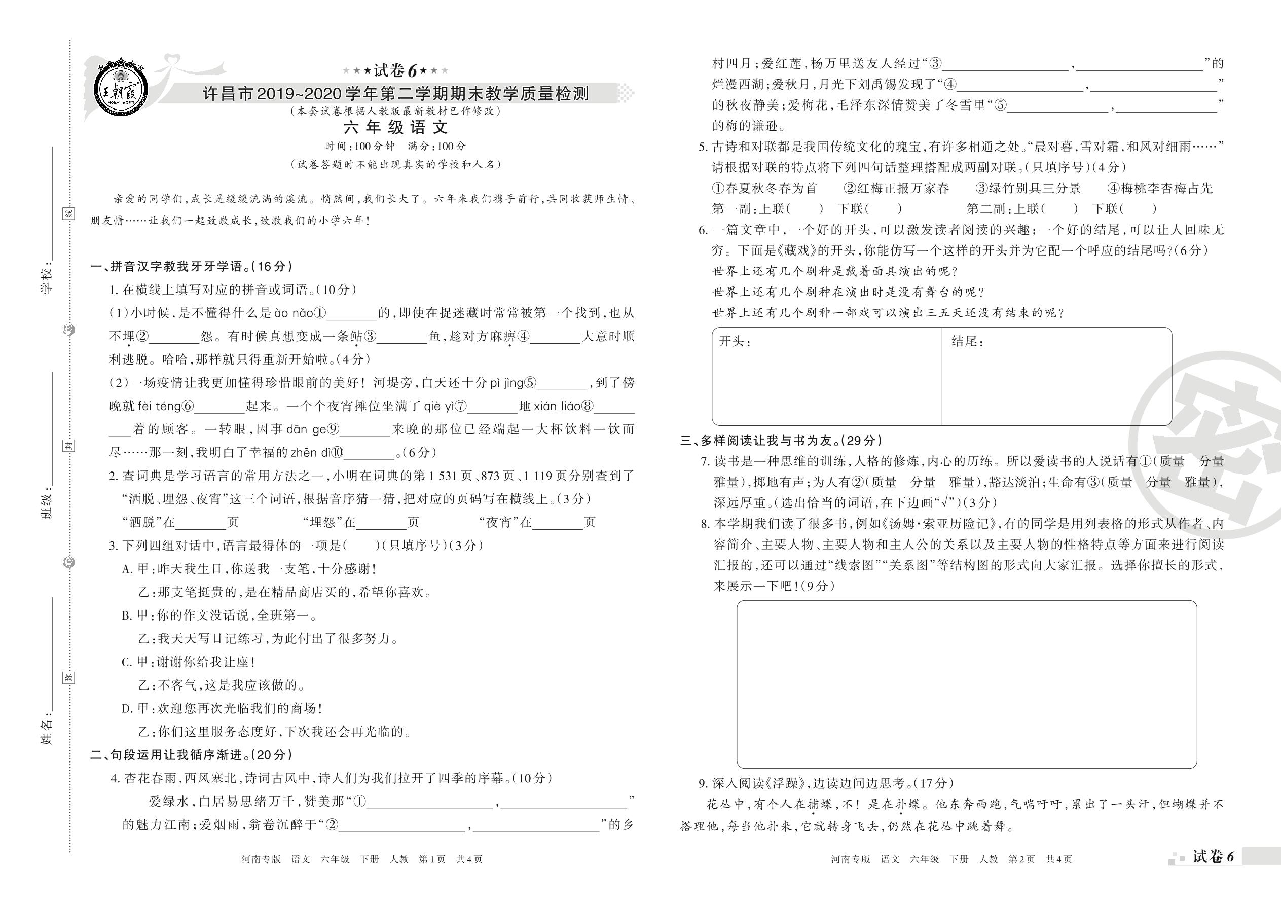 2019-2020学年第二学期许昌市六年级语文试卷(人教版)【6】