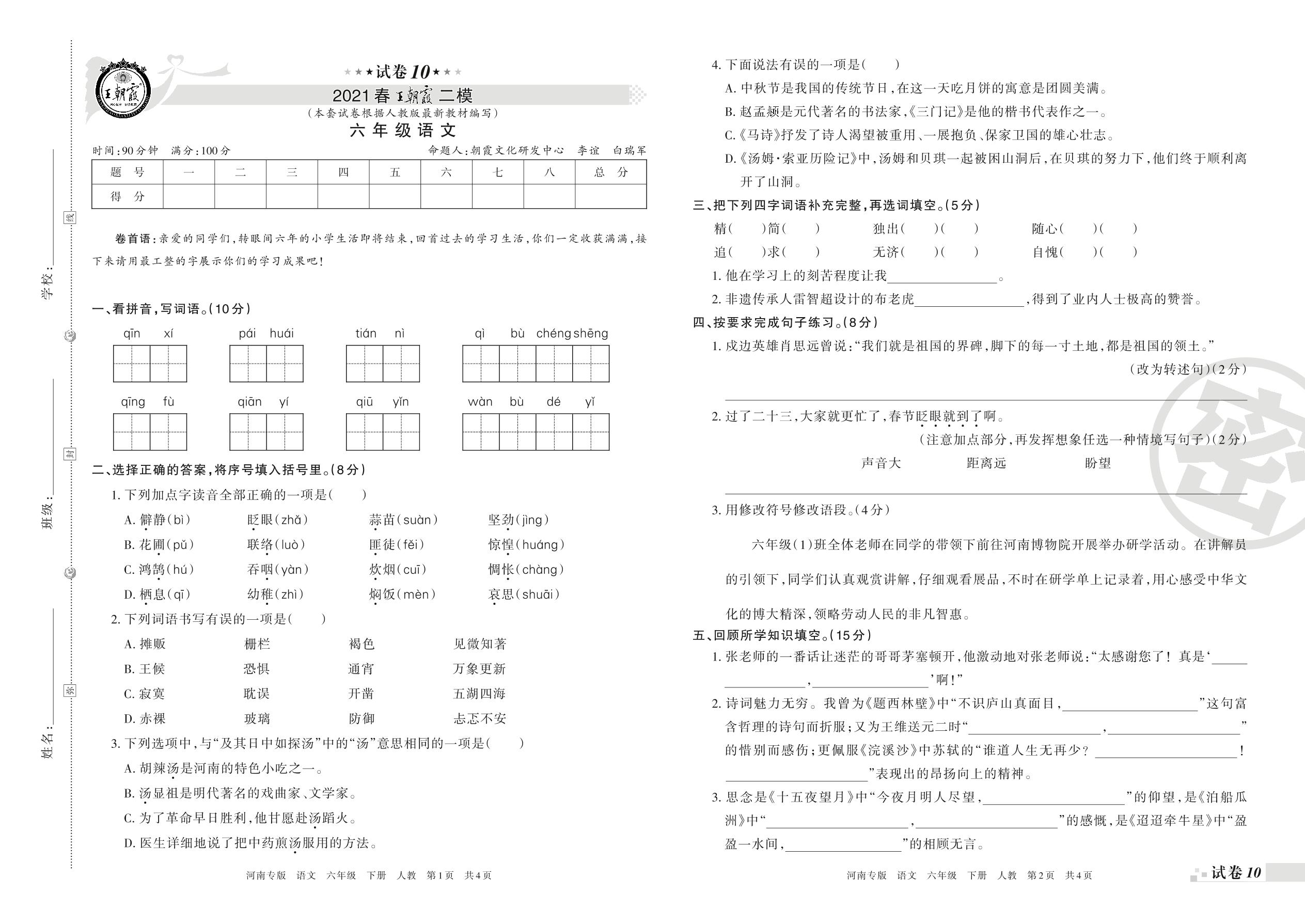 王朝霞期末模拟卷六年级下册语文(人教版)_R2108021817【10】