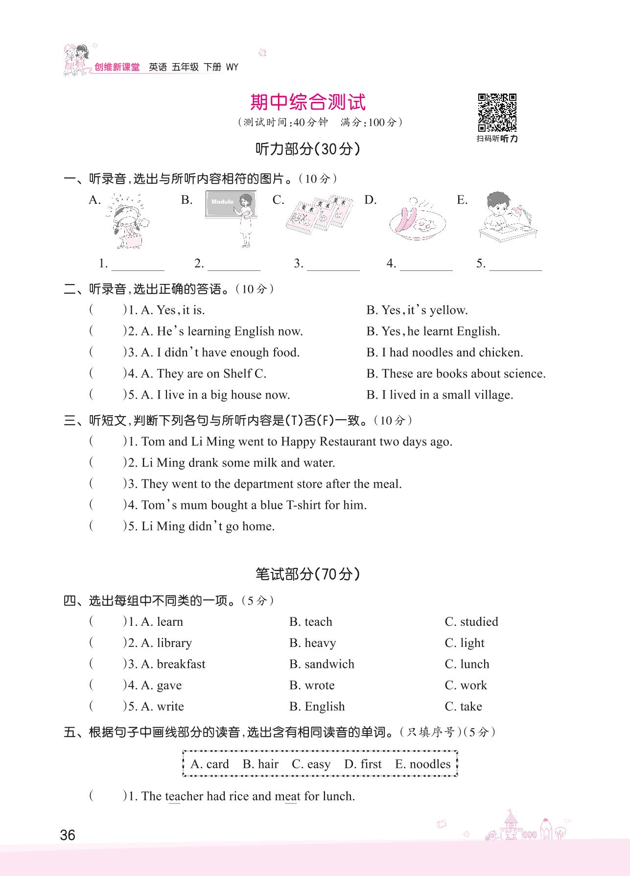 五年级英语外研版(三起始)下册期中卷