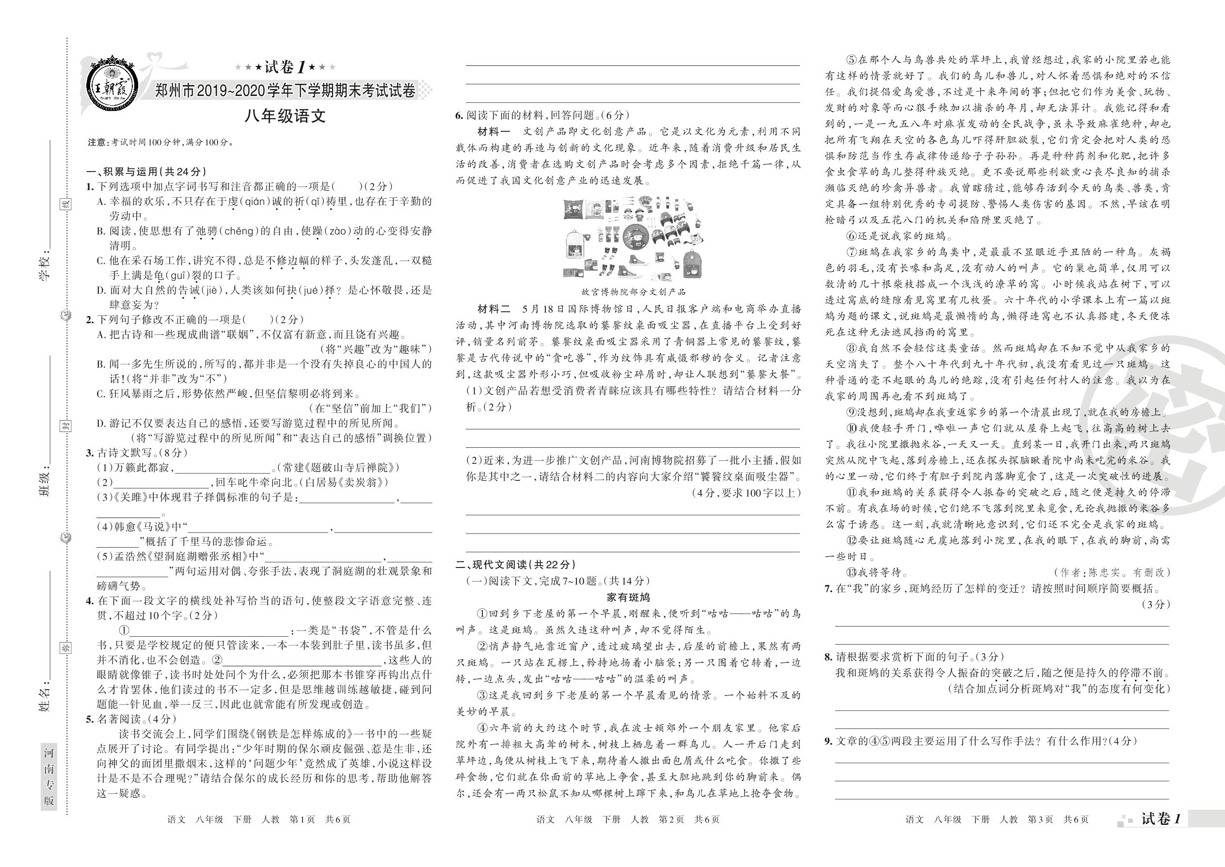 2019-2020学年第二学期郑州市八年级语文试卷(人教版)【1】