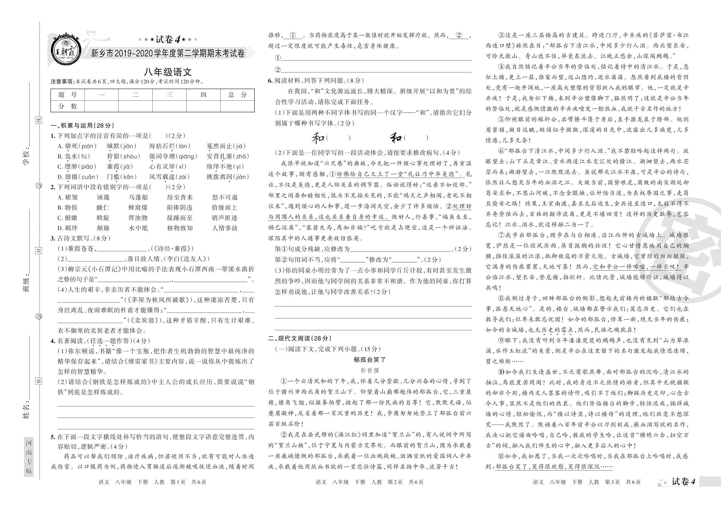 2019-2020学年第二学期新乡市八年级语文试卷(人教版)【4】