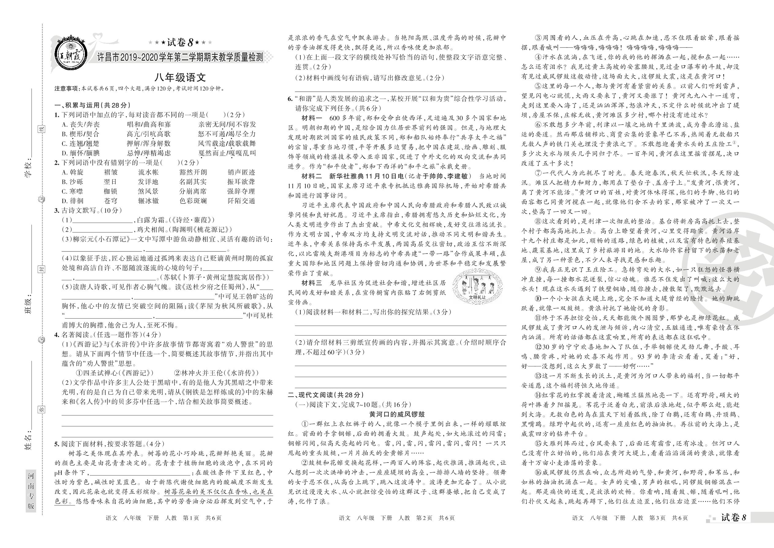 2019-2020学年第二学期许昌市八年级语文试卷(人教版)【8】