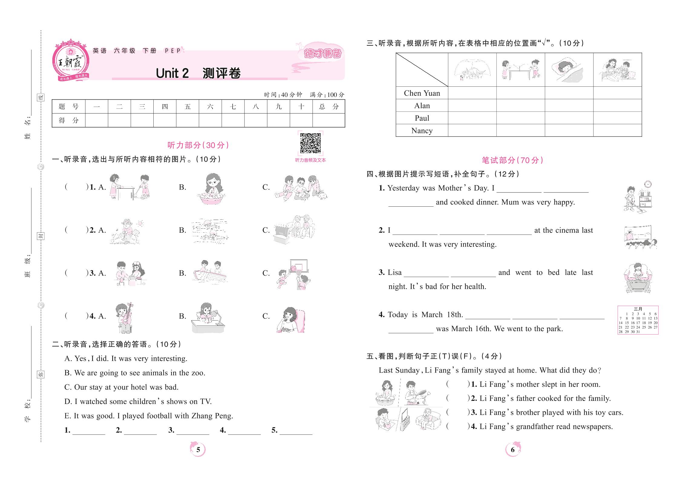 2022下册六年级英语人教PEP版 Unit 2 测评卷
