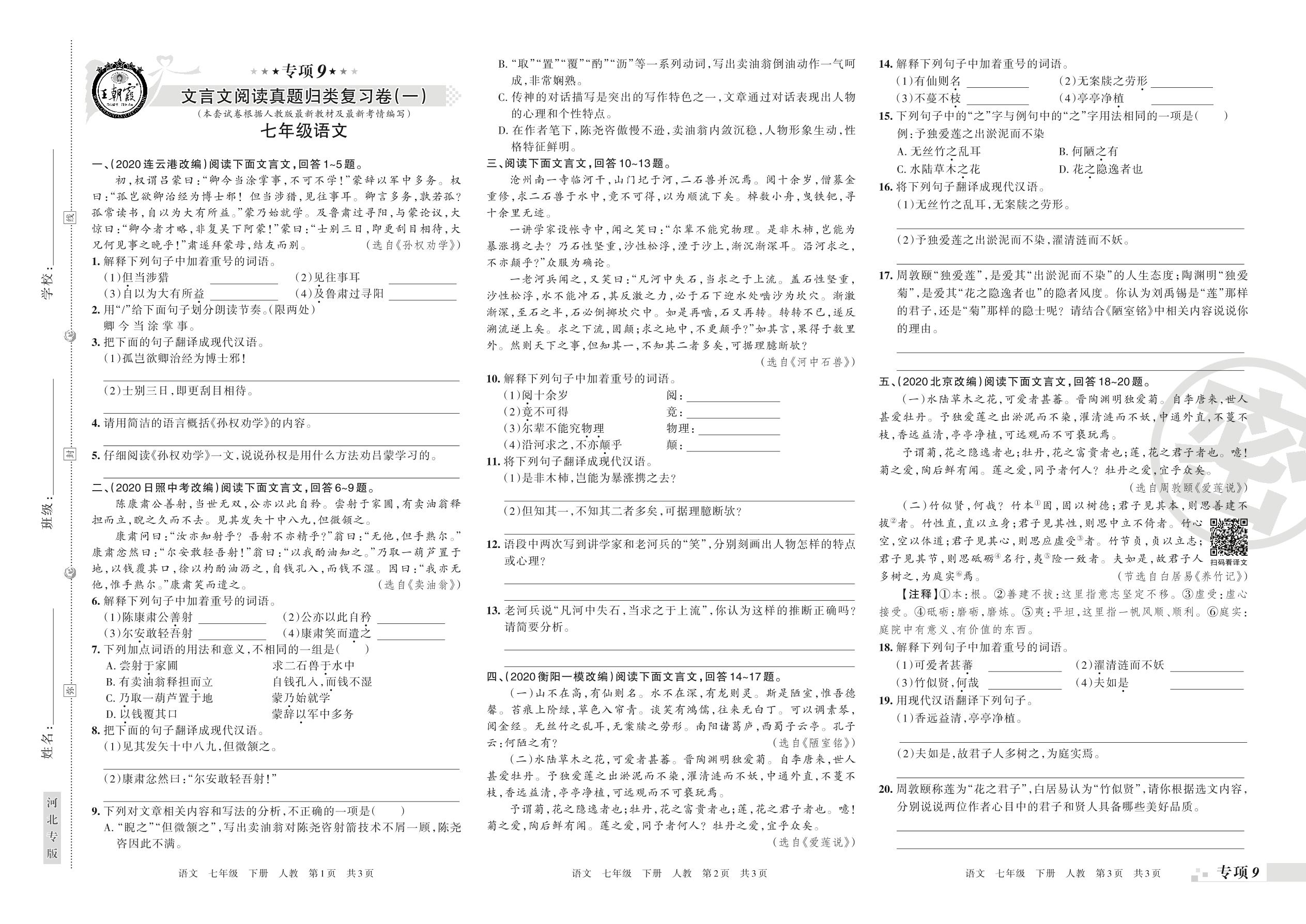 王朝霞期末专项卷——文言文阅读(一)、(二)真题归类复习七年级下册语文(人教版)【0】