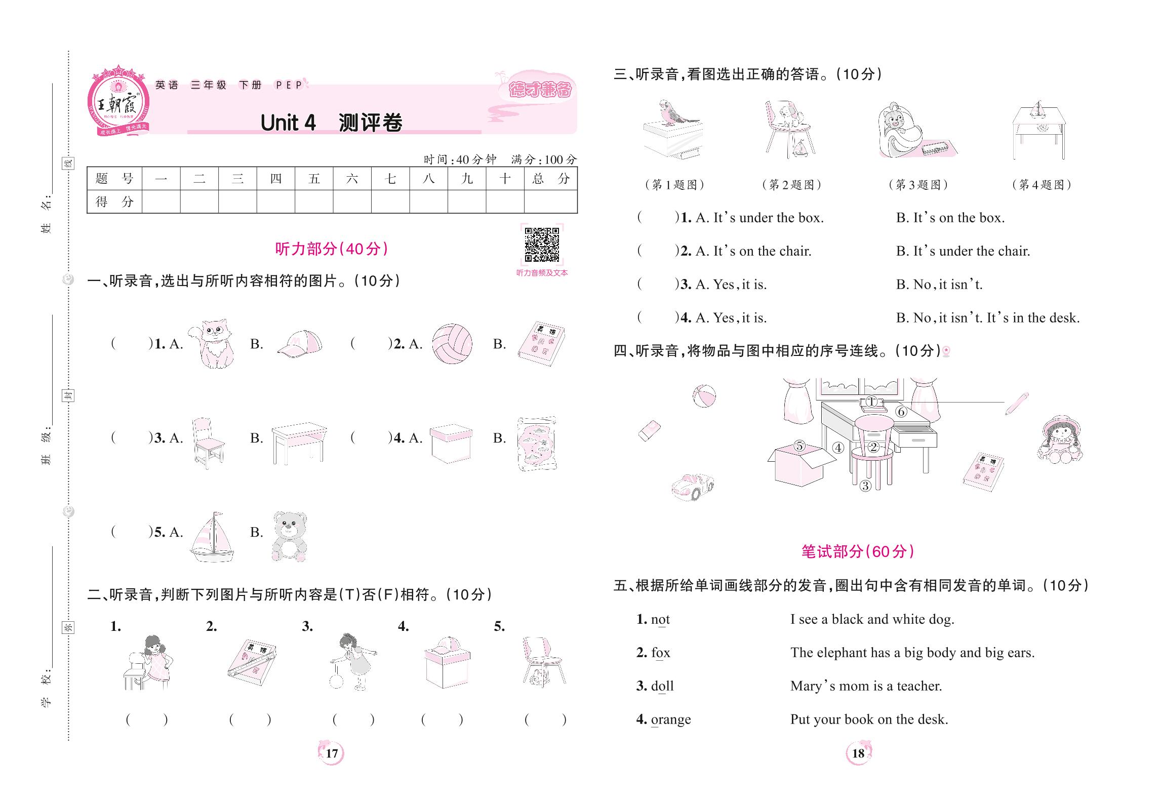 2022下册三年级英语人教PEP版 Unit 4 测评卷