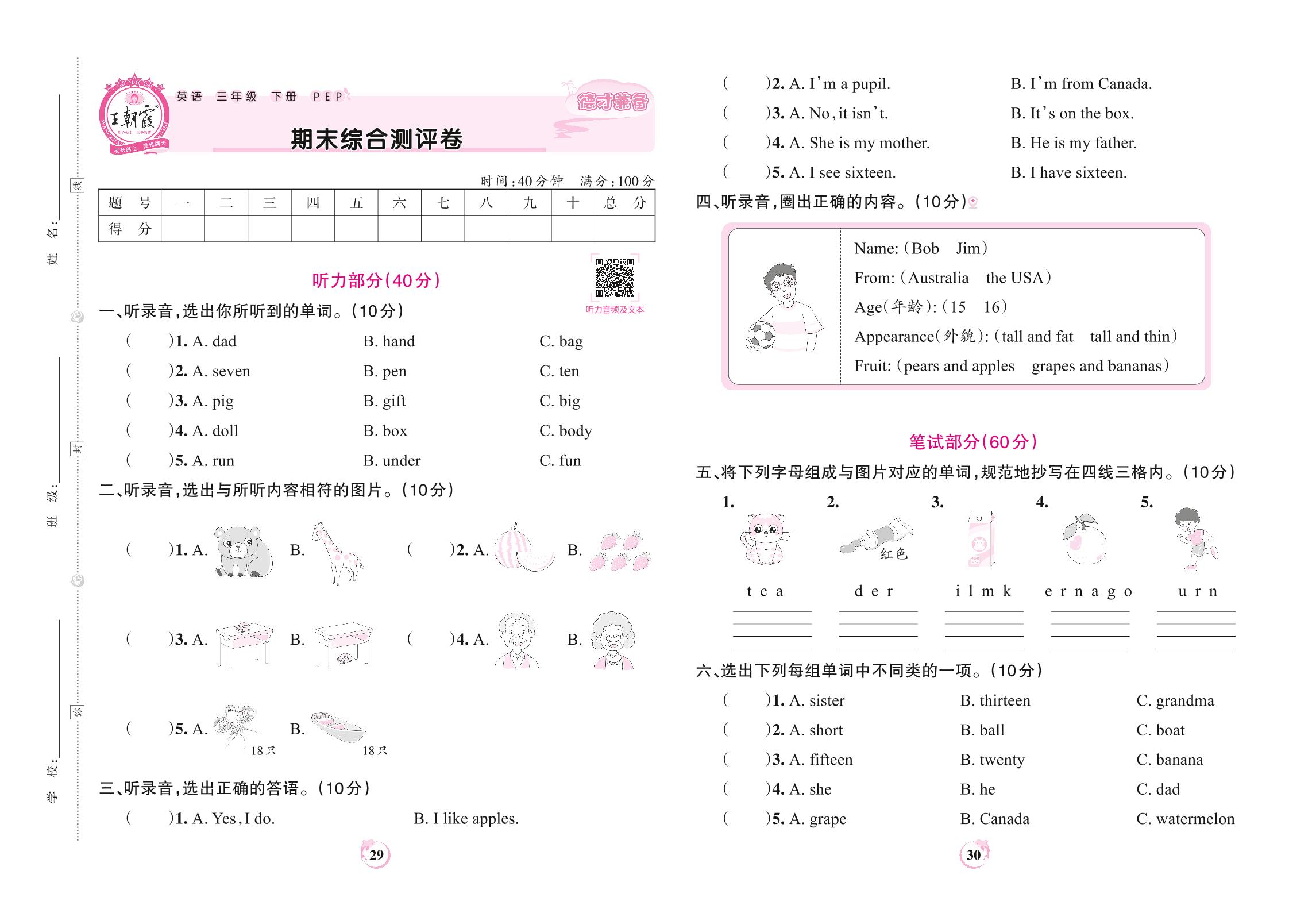 2022下册三年级英语人教PEP版 期末综合测评卷