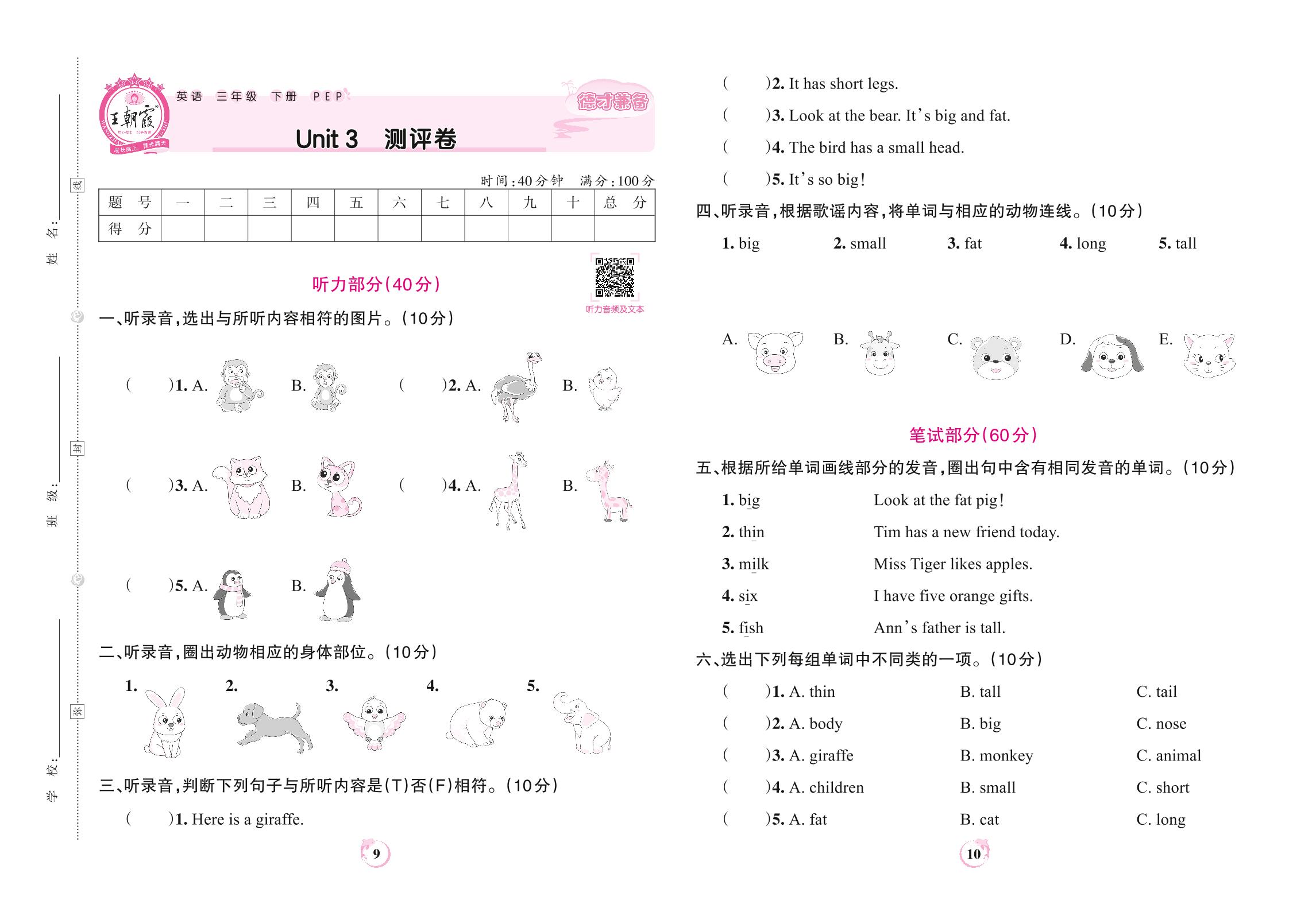 三年级英语人教PEP版(三起始)下册单元卷