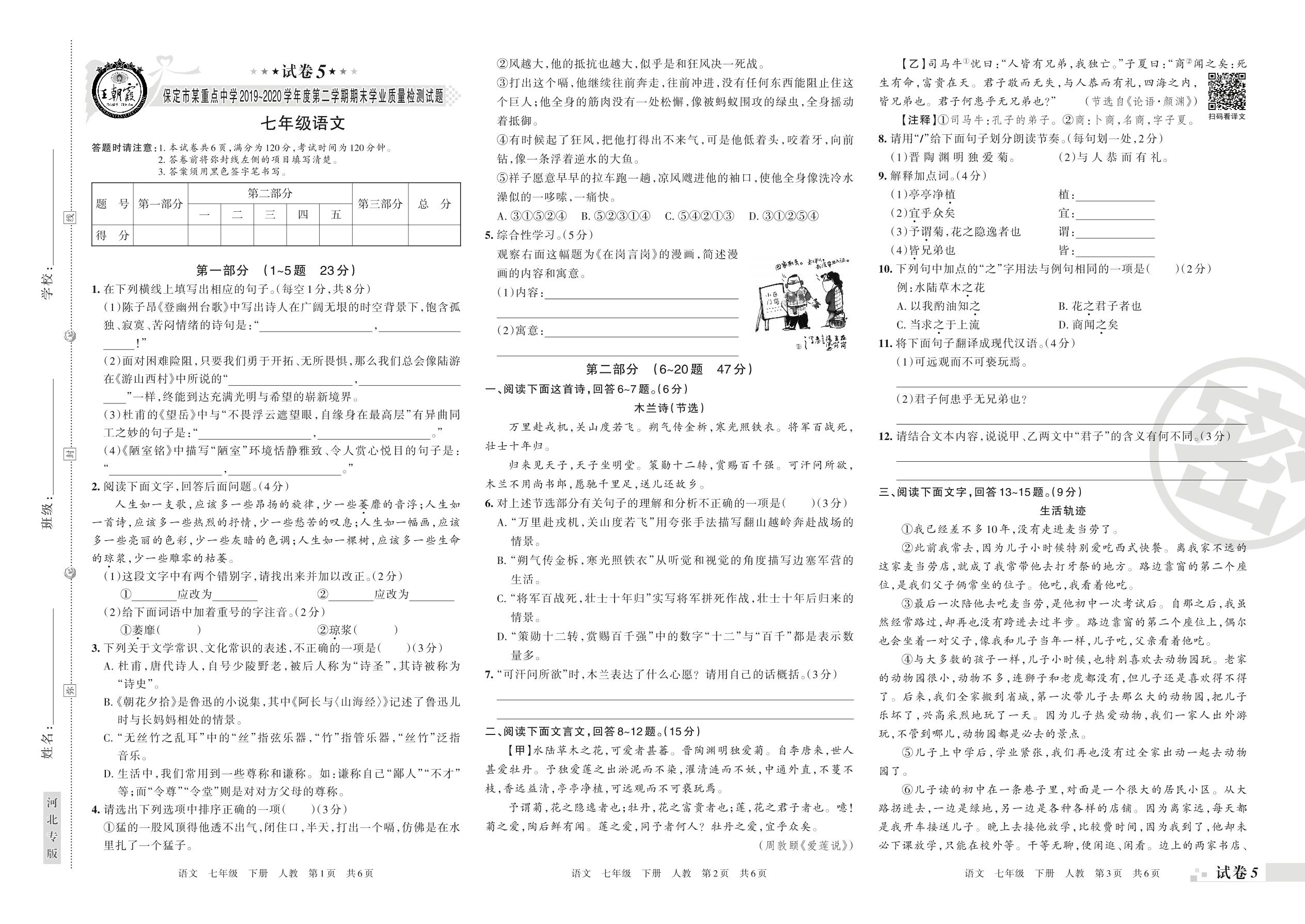 2019-2020学年第二学期保定市七年级语文试卷(人教版)【5】