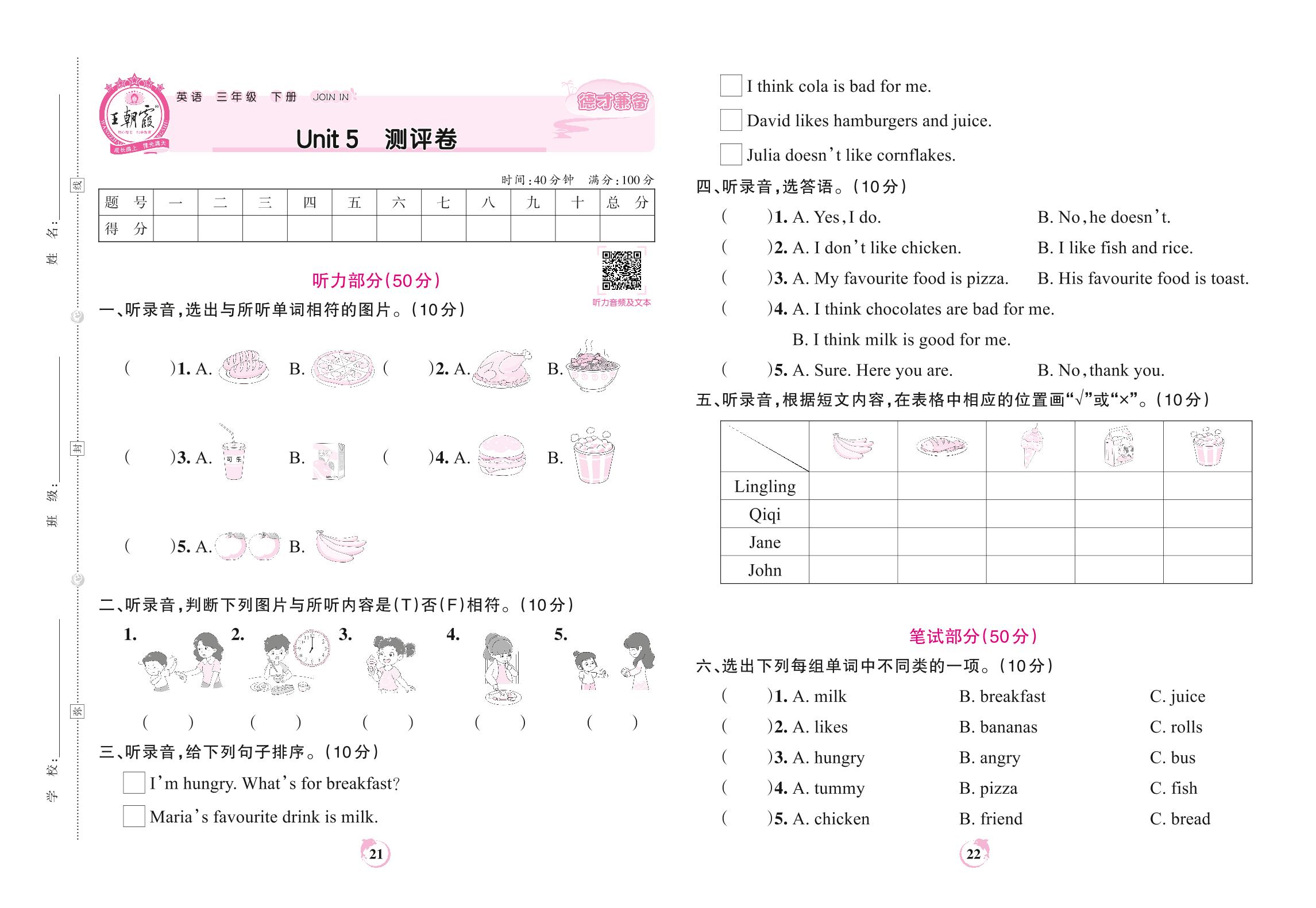 2022下册三年级英语剑桥版 Unit 5 测评卷