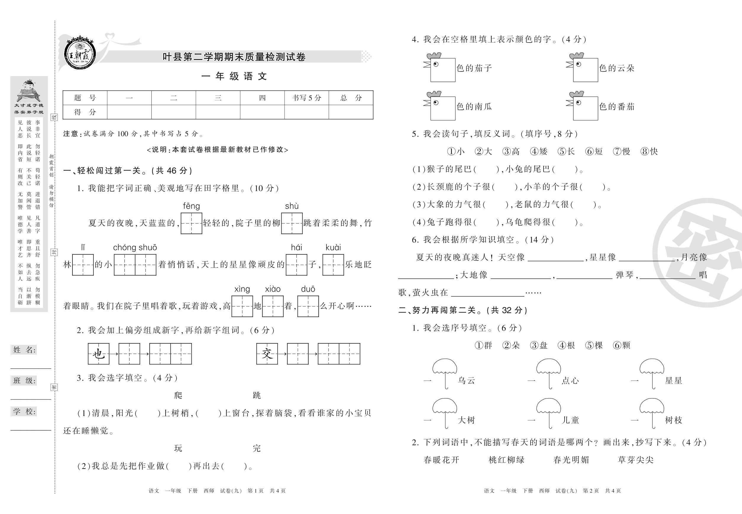 2015-2016学年第二学期平顶山市叶县一年级语文试卷(西师版)【9】