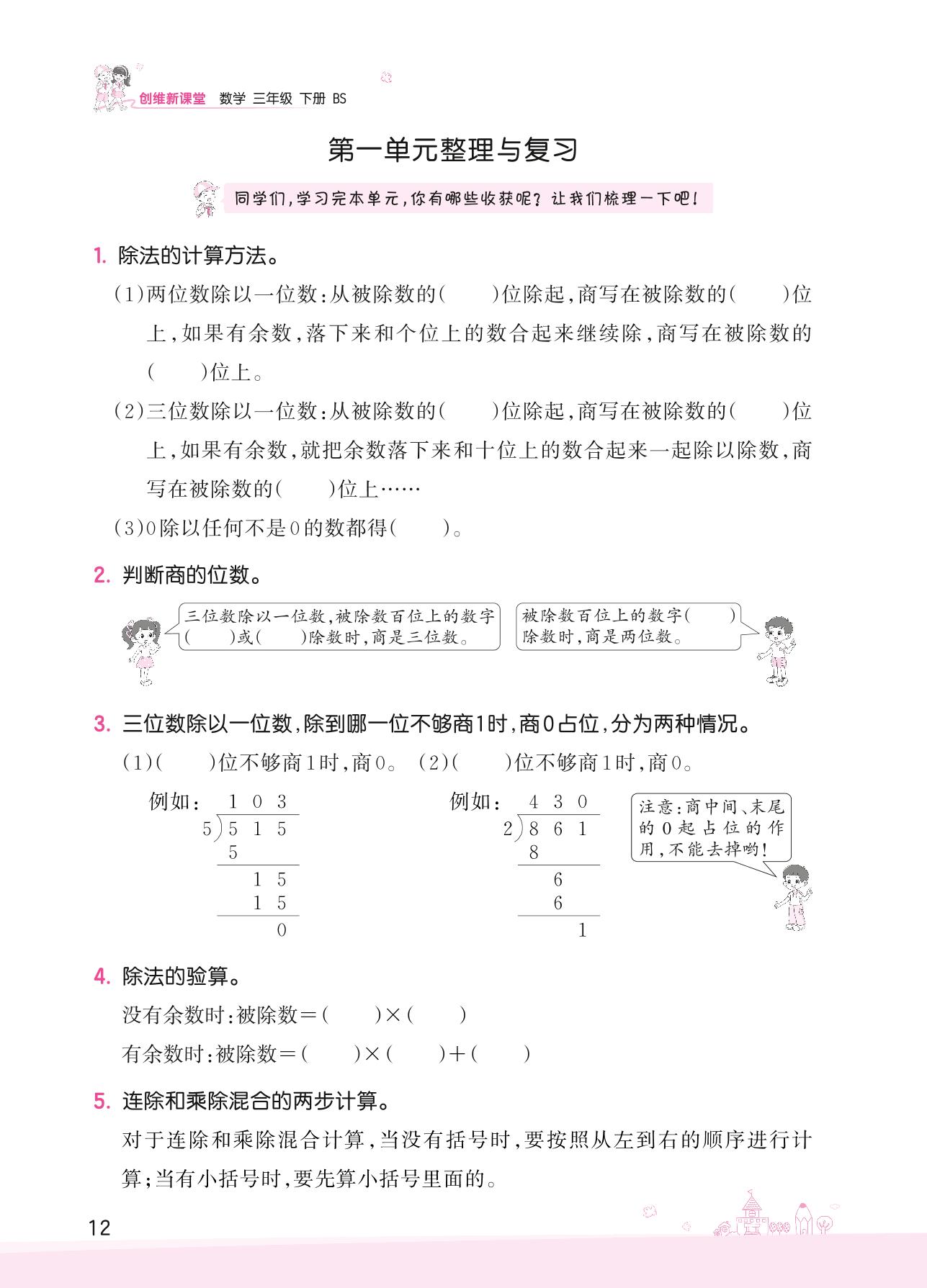 2022下册三年级数学北师版 一 除法——第一单元整理与复习