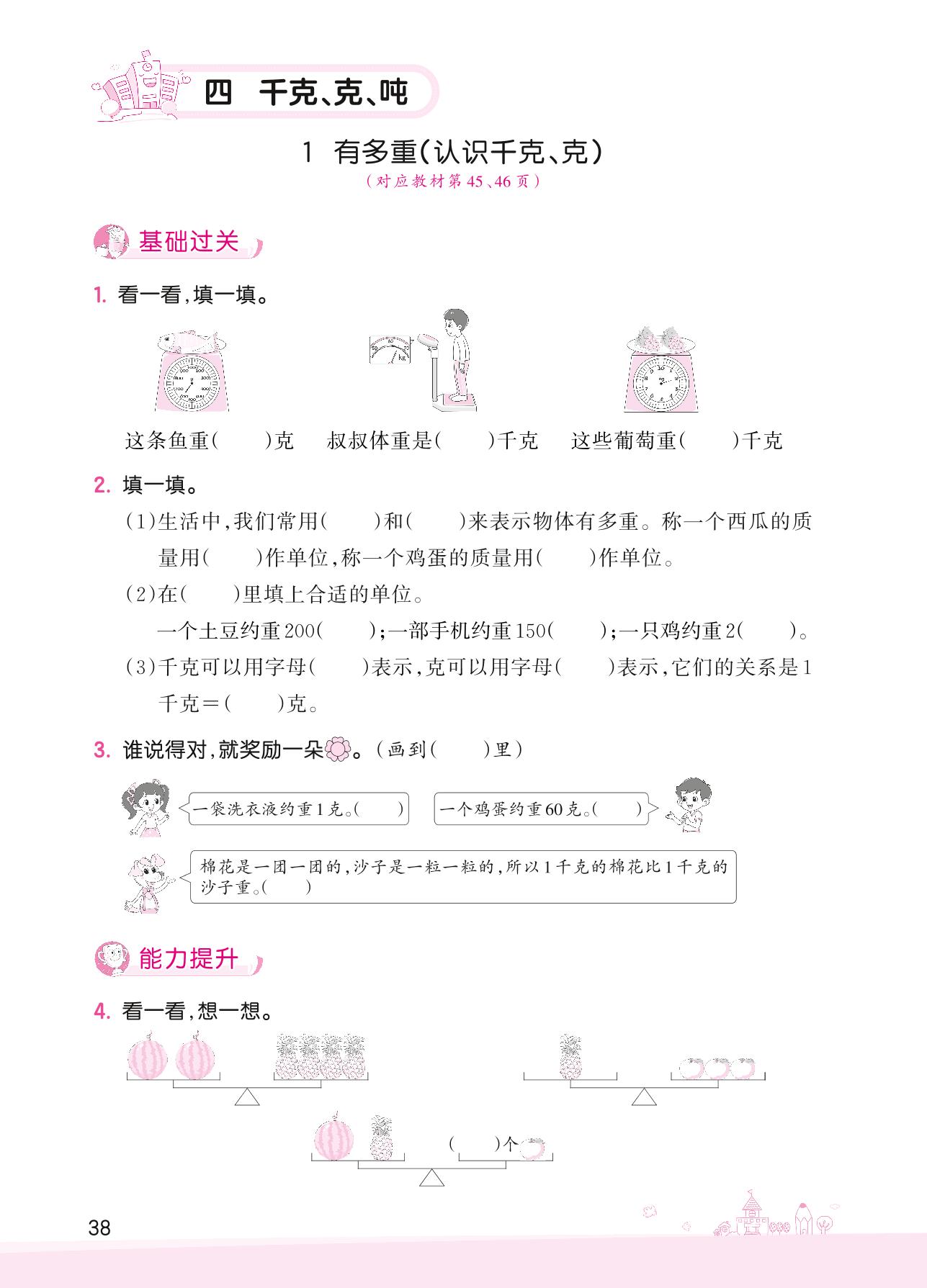 2022下册三年级数学北师版 四 千克、克、吨——1 有多重