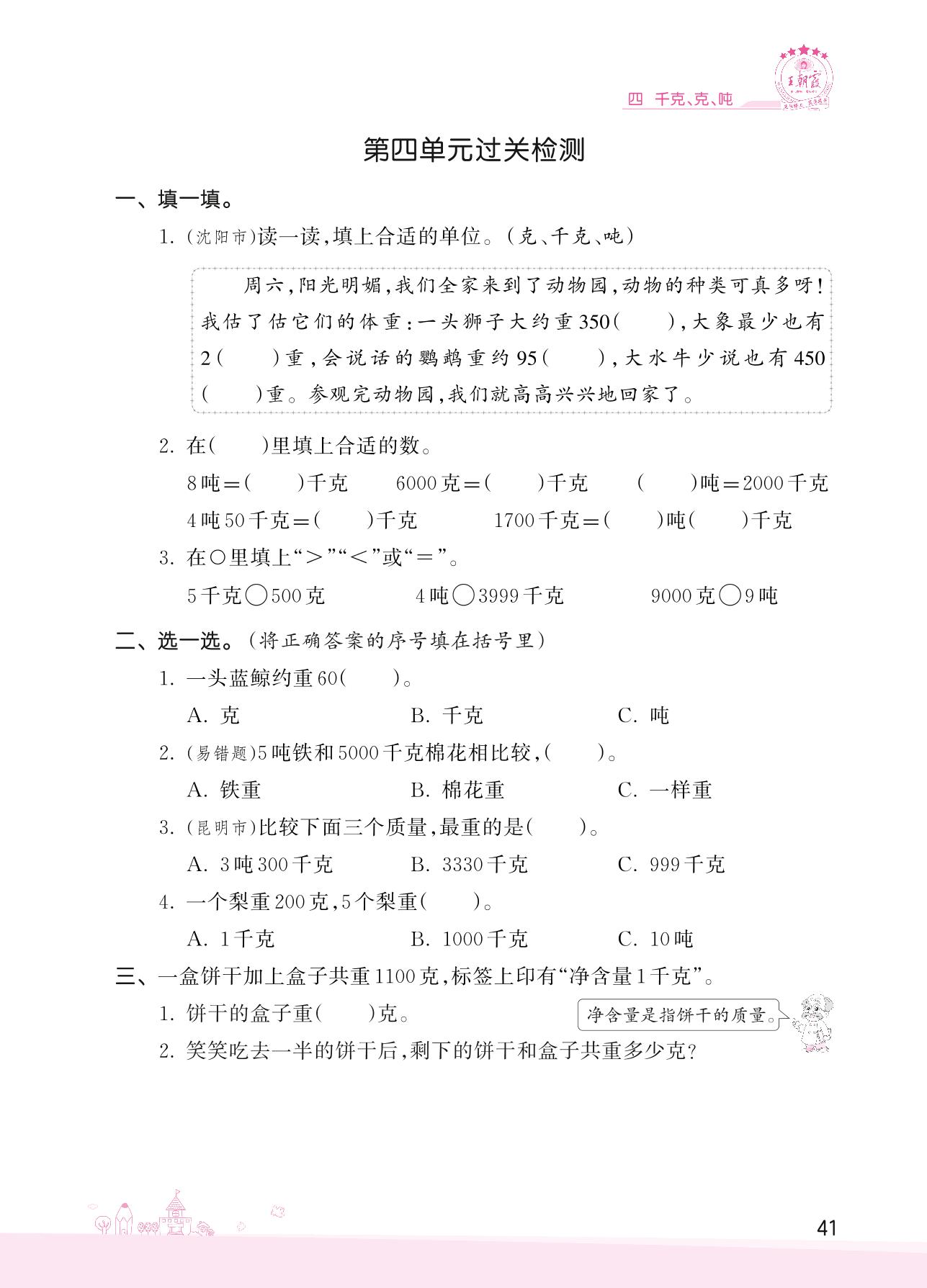 2022下册三年级数学北师版 四 千克、克、吨——第四单元过关检测
