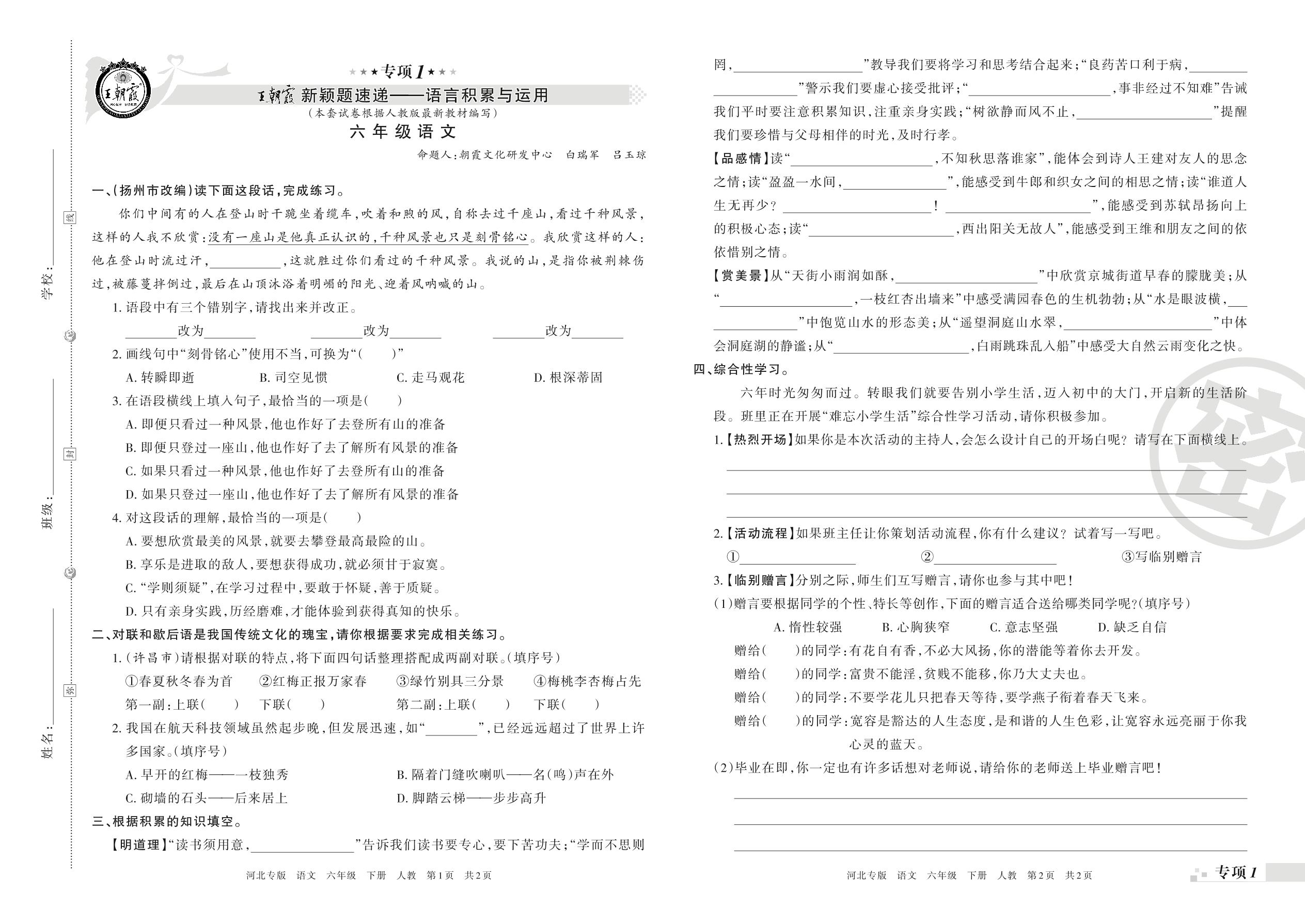 王朝霞期末专项卷——语言积累与运用、非连续性文本阅读六年级下册语文(人教版)_R2108022724【0】