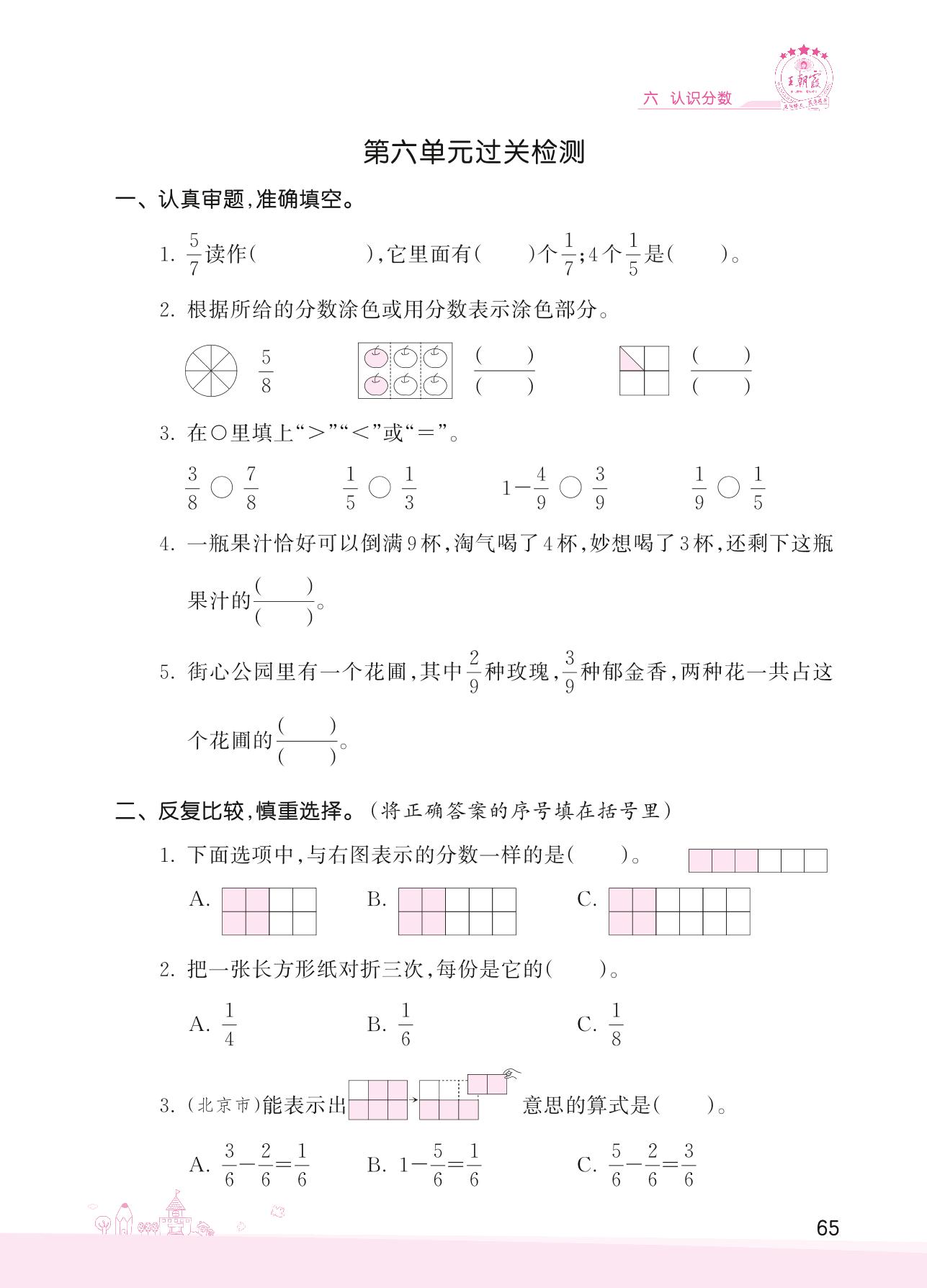 2022下册三年级数学北师版 六 认识分数——第六单元过关检测