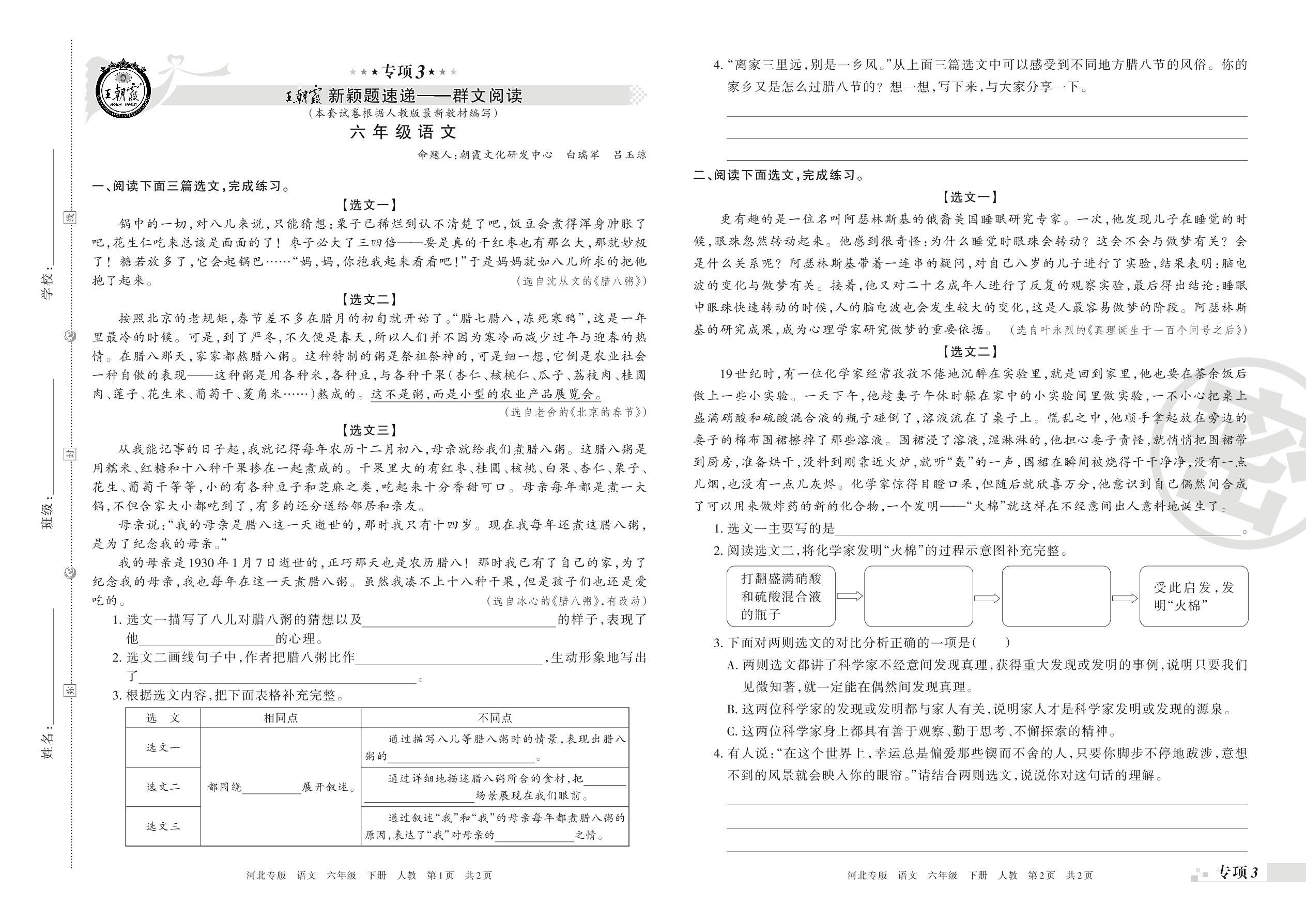 王朝霞期末专项卷——群文阅读、古诗文阅读六年级下册语文(人教版)【0】