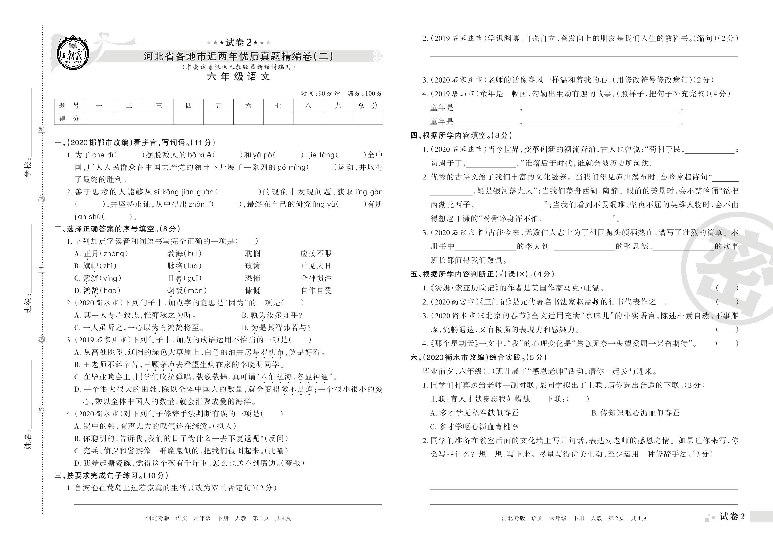 河北省各地市近两年优质真题精编卷(二)六年级下册语文(人教版)【2】