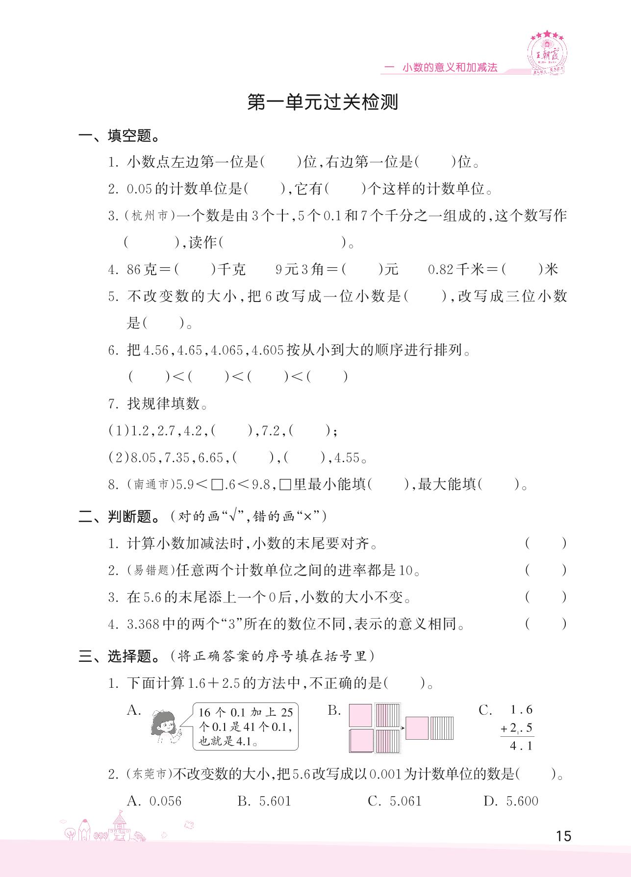 2022下册四年级数学北师版 一 小数的意义和加减法——第一单元过关检测