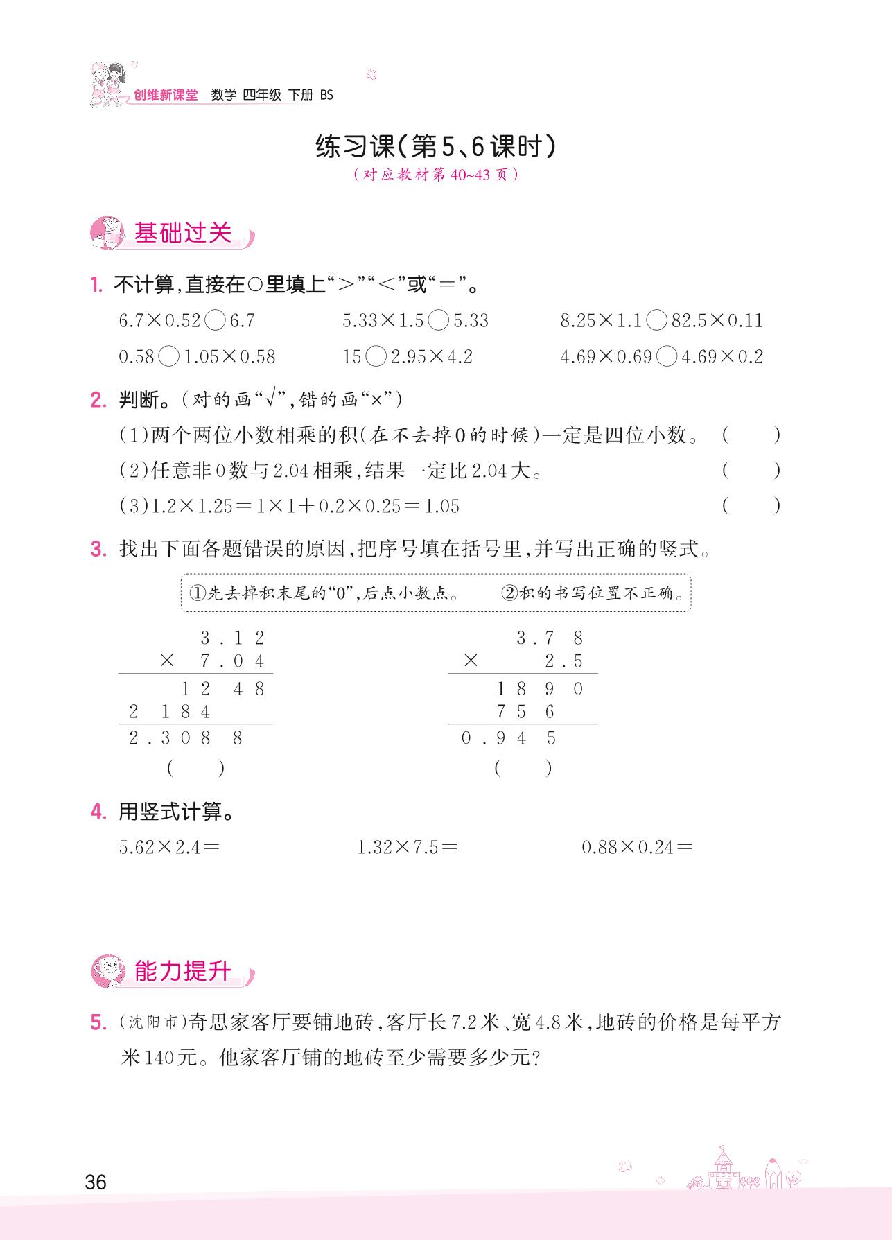2022下册四年级数学北师版 三 小数乘法——练习课(第5、6课时)