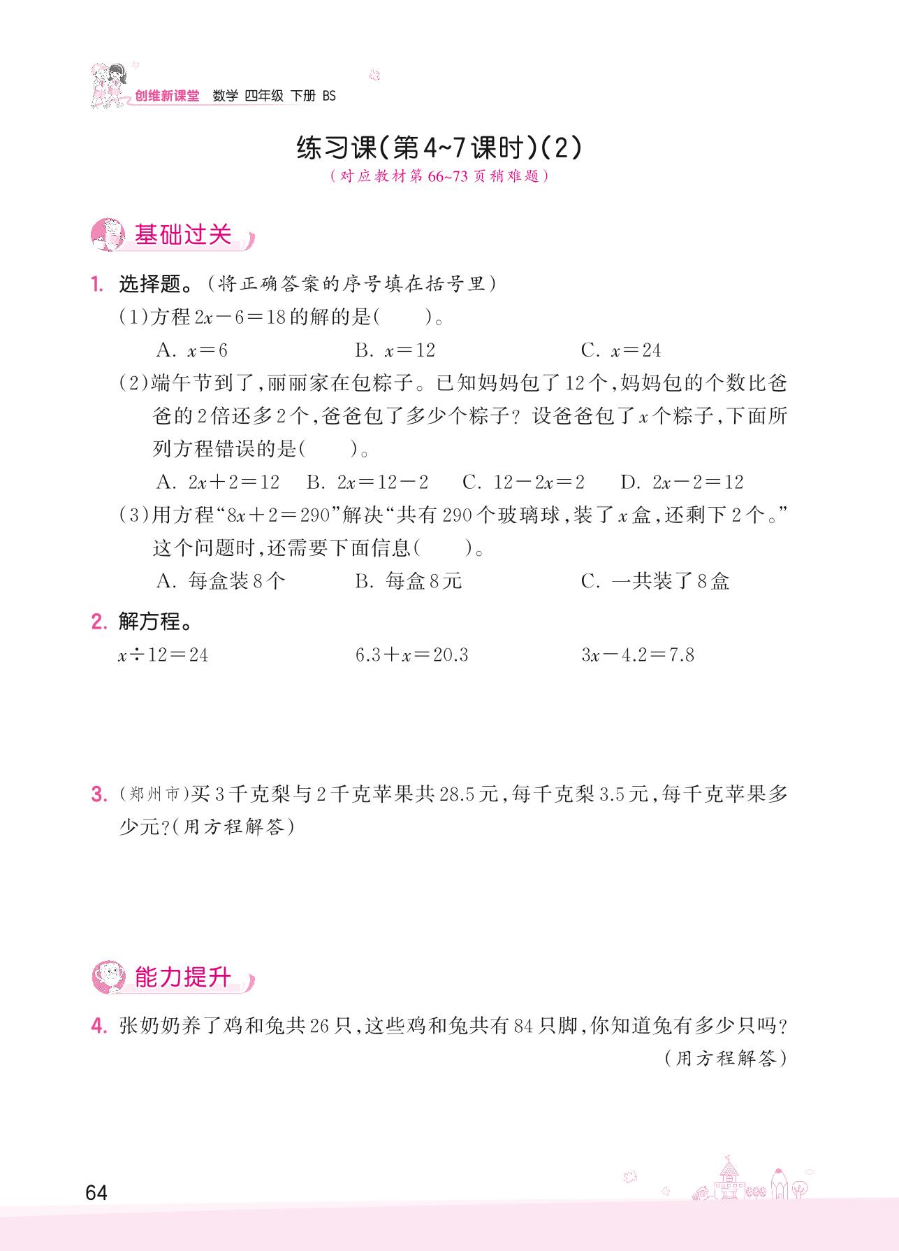 2022下册四年级数学北师版 五 认识方程——练习课(第4~7课时)(2)