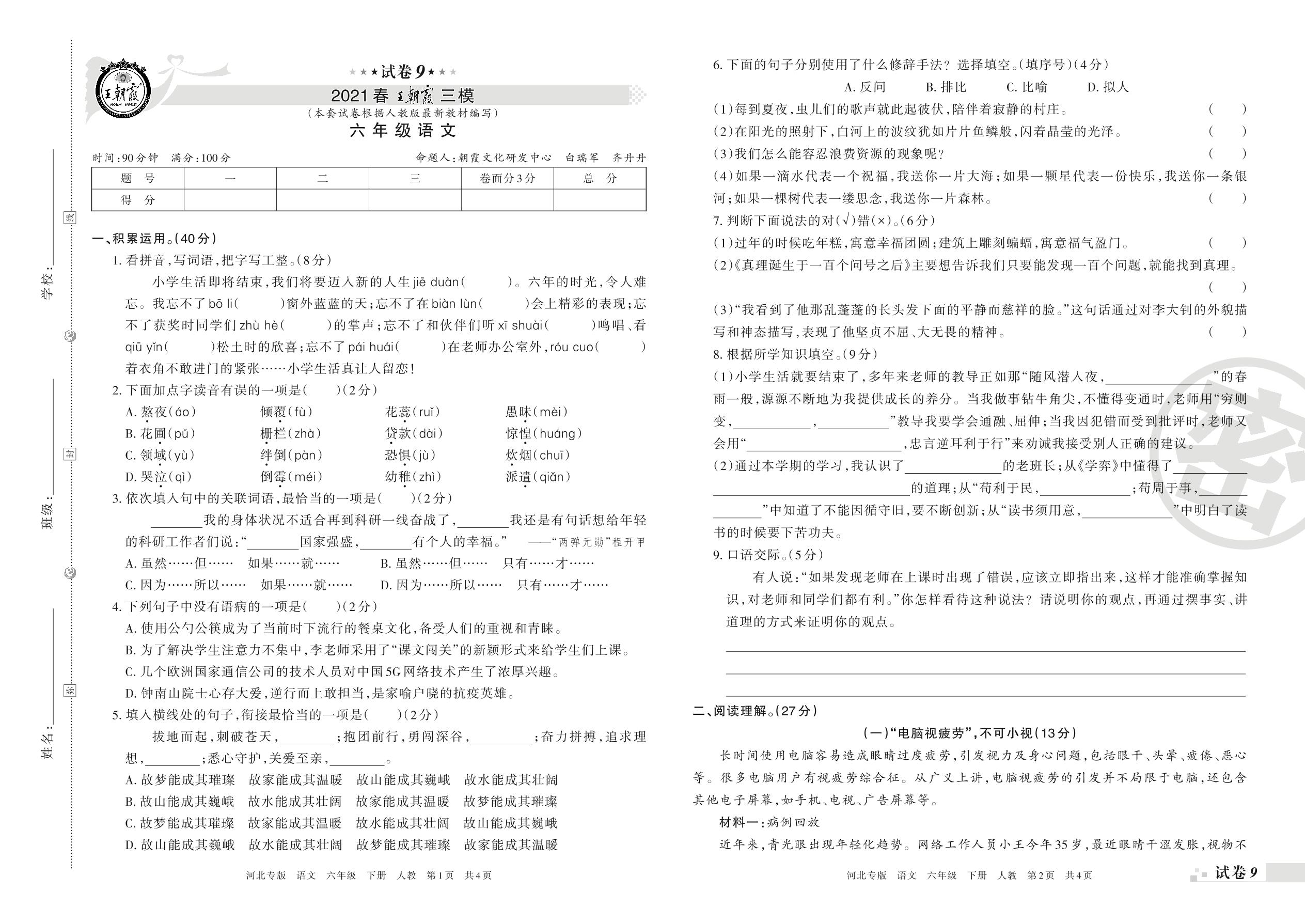 王朝霞期末模拟卷六年级下册语文(人教版)_R2108022827【9】