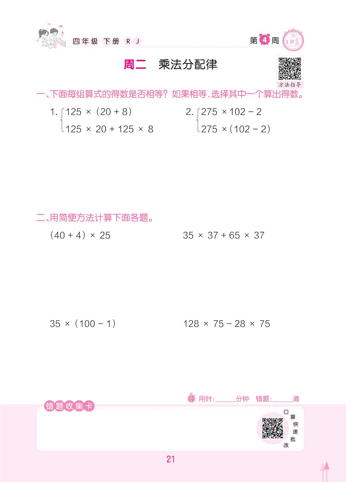 2022下册四年级数学人教版 第4周 周二