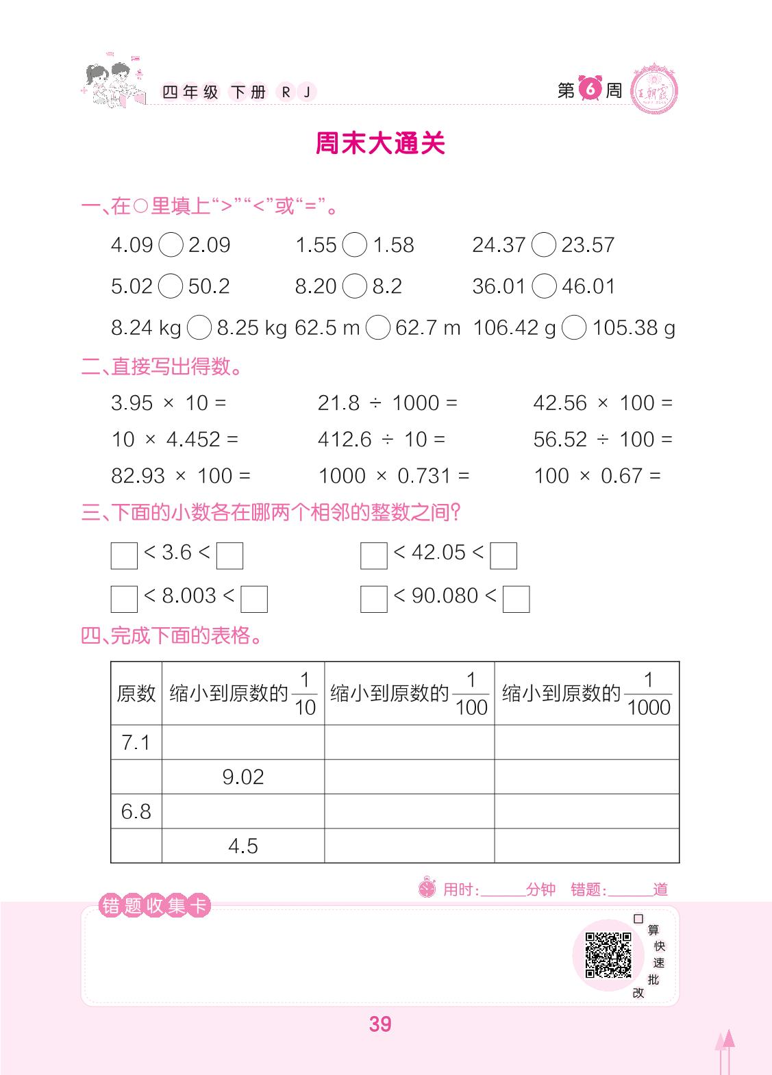 2022下册四年级数学人教版 第6周 周末大通关