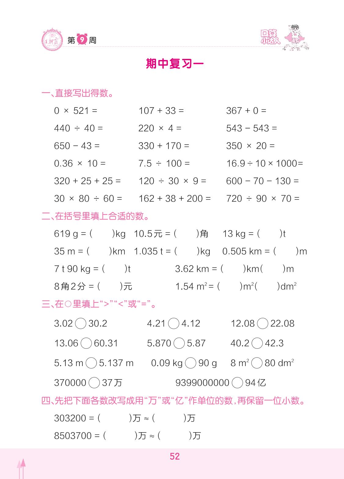 2022下册四年级数学人教版 期中复习一(计算专练)