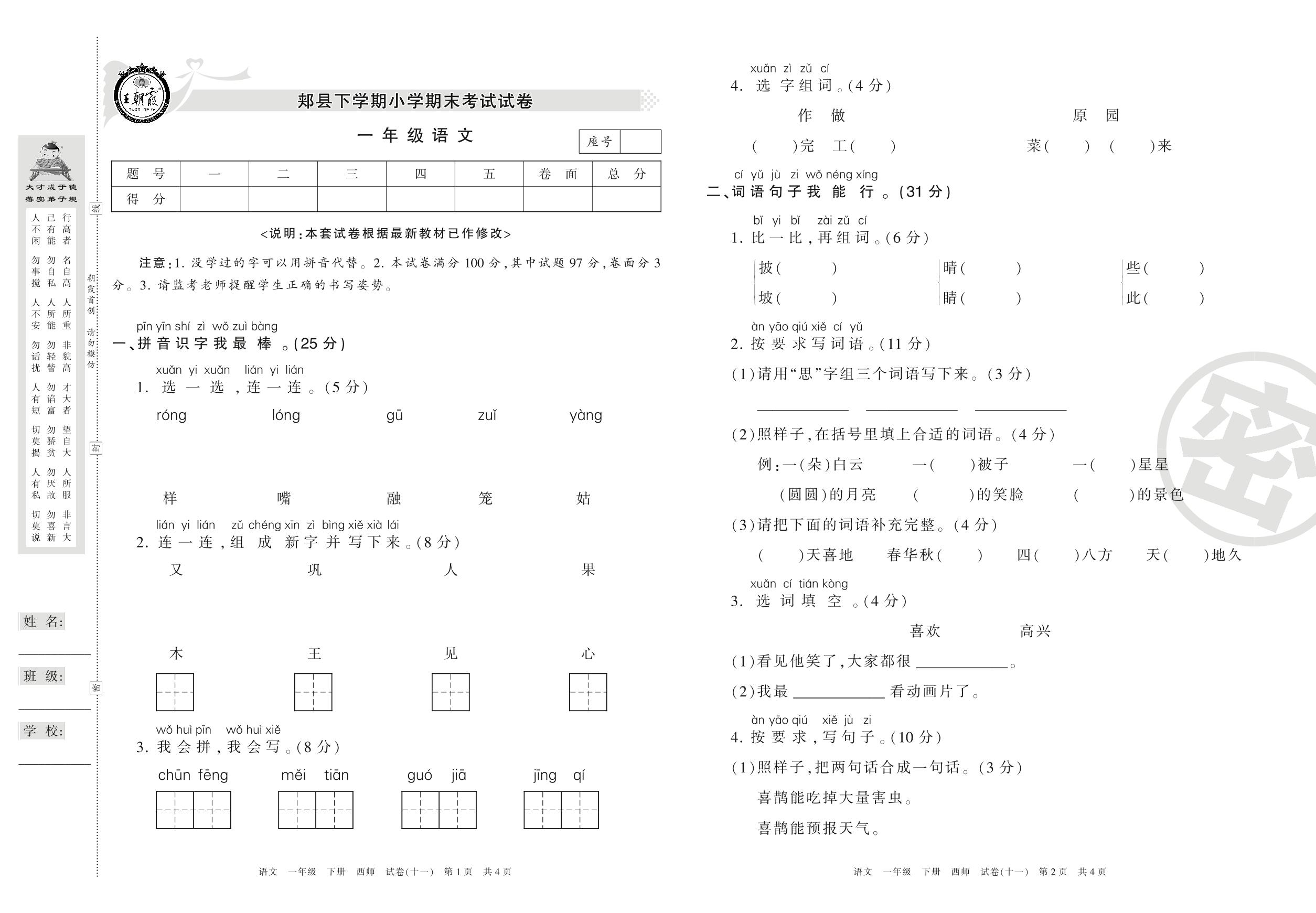 2015-2016学年第二学期平顶山市郏县一年级语文试卷(西师版)【11】