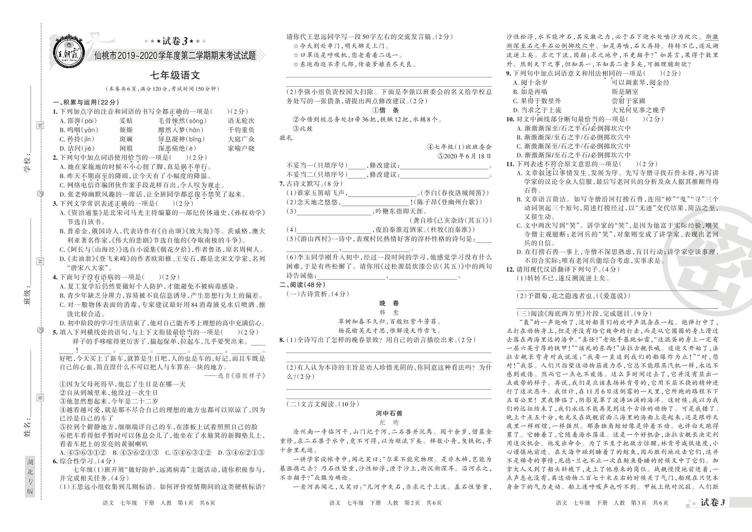 2019-2020学年第二学期仙桃市七年级语文试卷(人教版)【3】