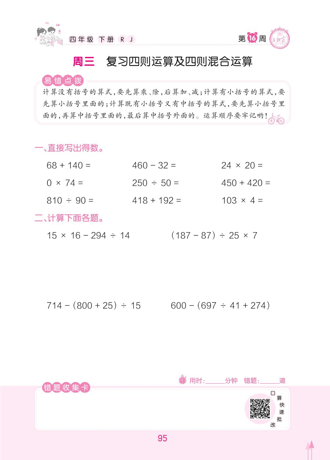 2022下册四年级数学人教版 第16周 周三