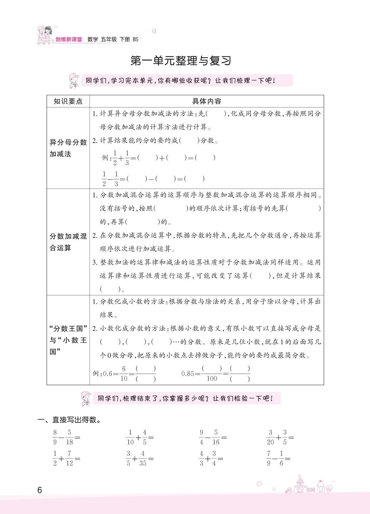 2022下册五年级数学北师版 一 分数加减法——第一单元整理与复习