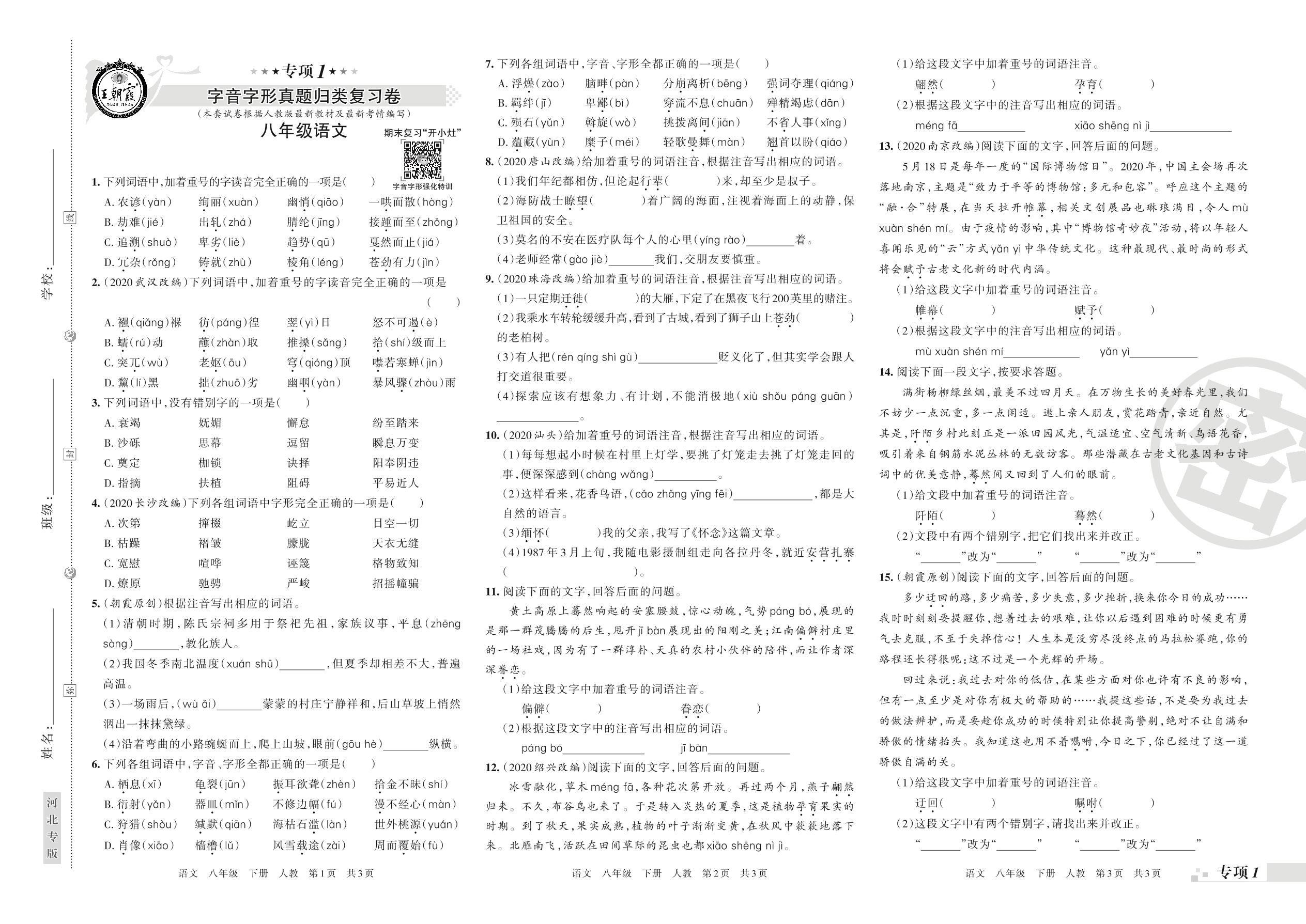 王朝霞期末专项卷——字音字形、词语理解与运用真题归类复习八年级下册语文(人教版)【0】