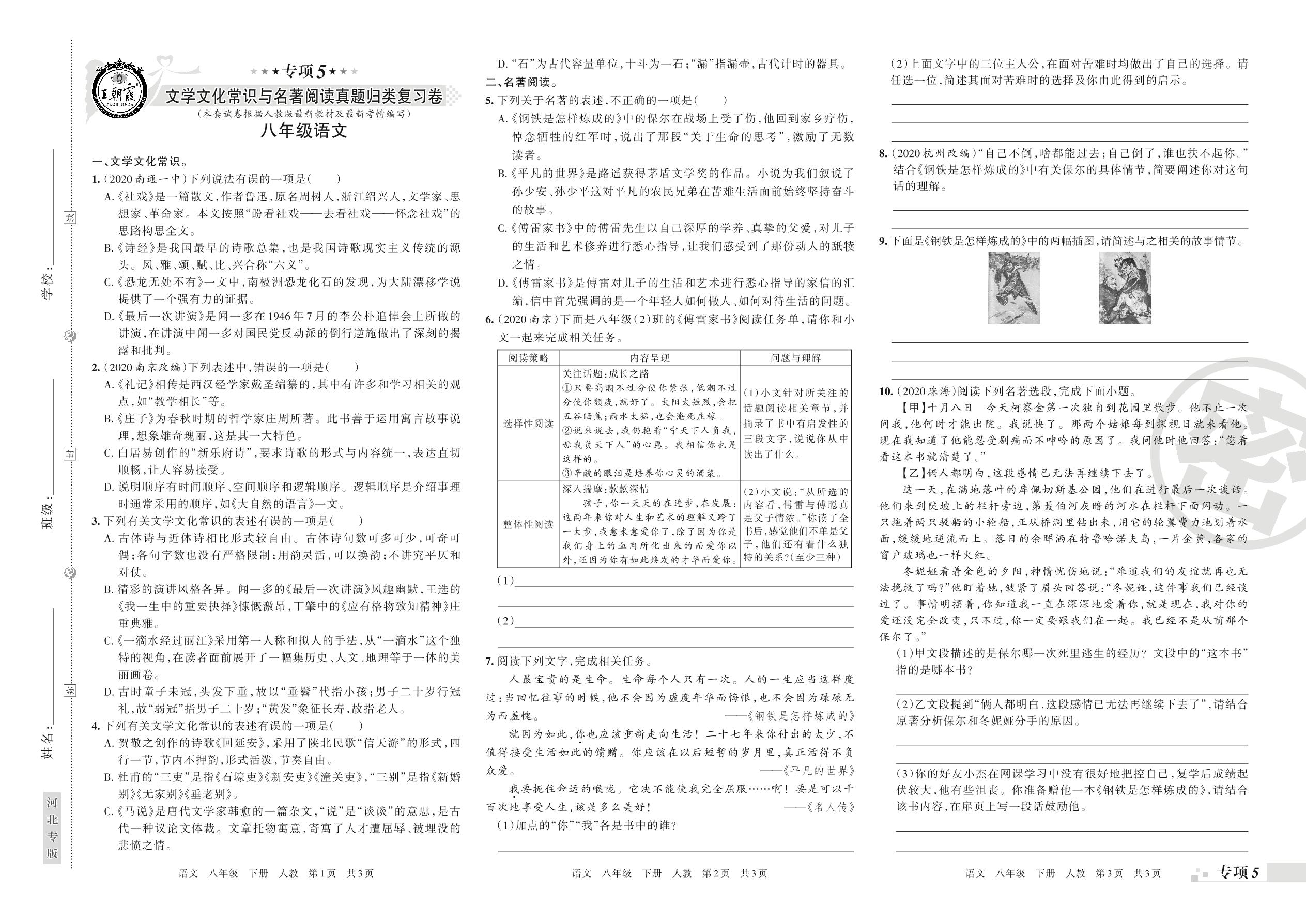 王朝霞期末专项卷——文学文化常识与名著阅读、口语交际与综合性学习真题归类复习八年级下册语文(人教版)【0】