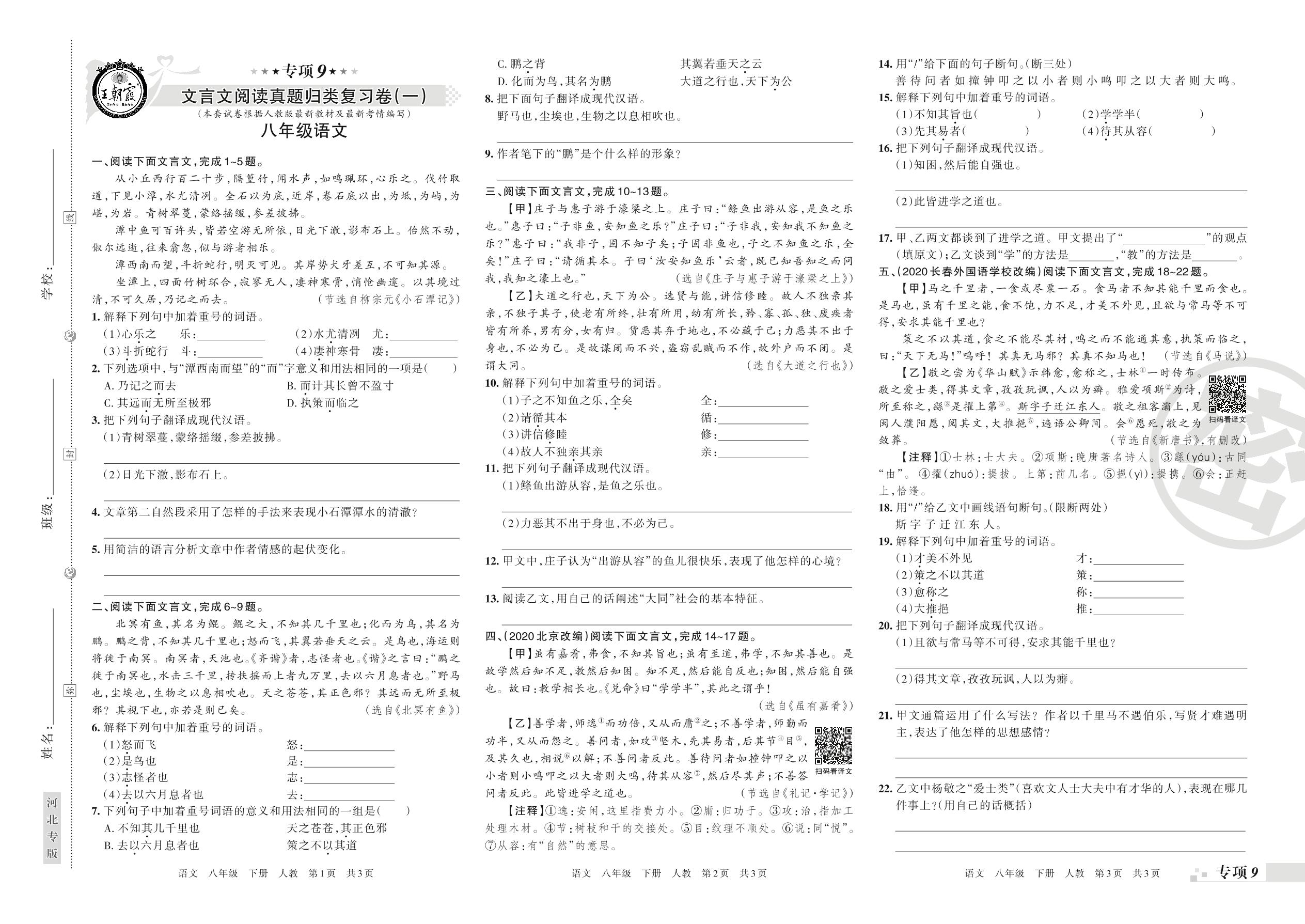 王朝霞期末专项卷——文言文阅读(一)、(二)真题归类复习八年级下册语文(人教版)【0】