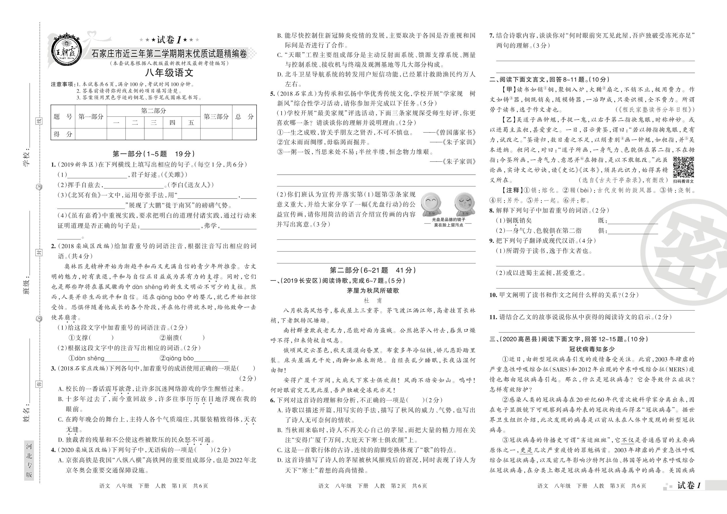 2019-2020学年第二学期石家庄市精编卷八年级语文试卷(人教版)【1】